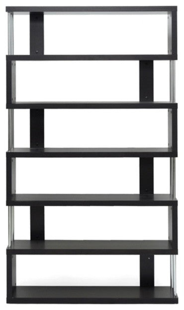 This artsy, modern bookcase gets you organized with style. Our Barnes Bookcase is made of dark brown faux wood grain paper veneer over and engineered wood frame and features chromed steel side supports. Not only does this modern display shelf house books, but it is also the perfect place to show off your prized vases, decor, and home accents. The Barnes Bookcase requires assembly, and should be dry dusted. Separately offered is the Barnes Bookcase with three shelves.