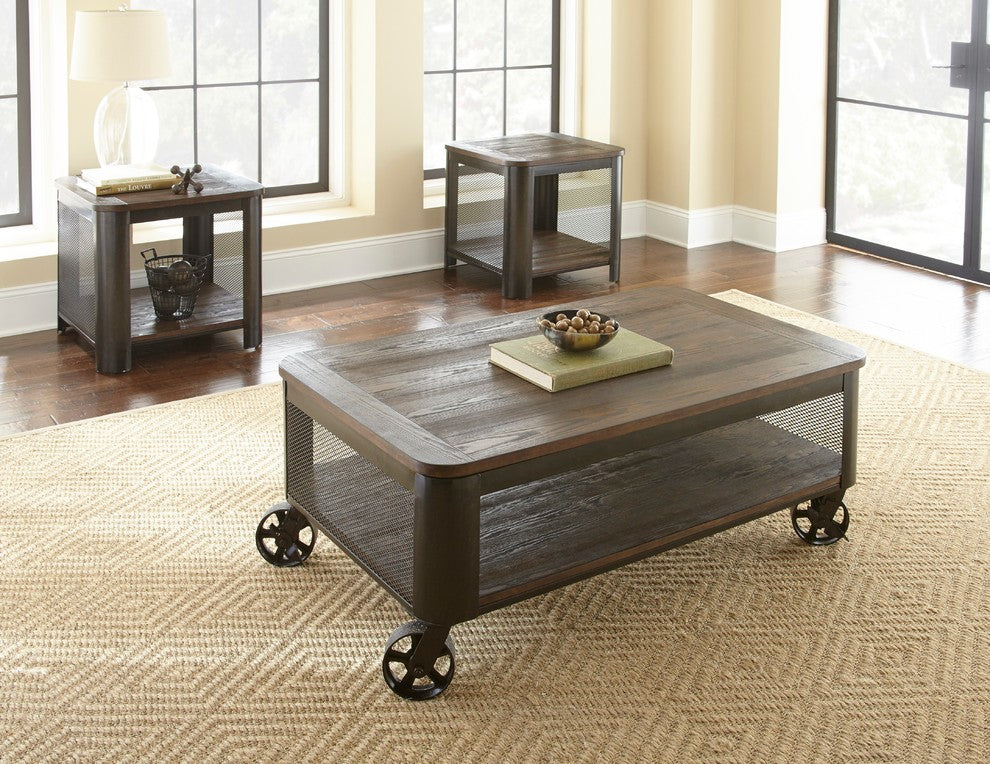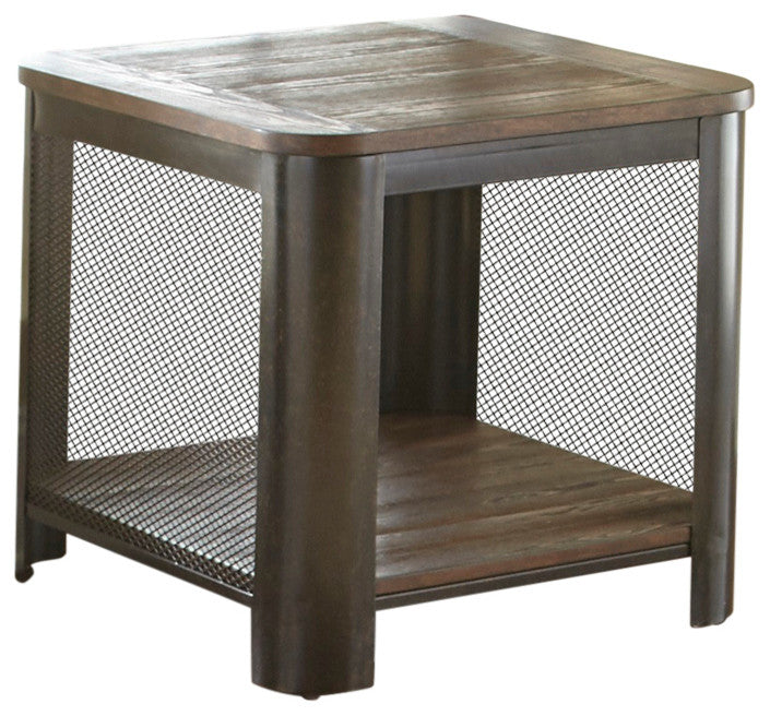 The Barrow End Table has both style and function with industrial styling and a bottom shelf for additional storage or display space. This table combines a rustic wire-brushed, plank top wood effect with industrial metal and wire mesh accents for a look that works in both urban and suburban settings. Your purchase includes one end table.Pine veneers in a mocha finishWire brushed, plank effect topWire mesh endsDimensions: 26" x 26"x 24"