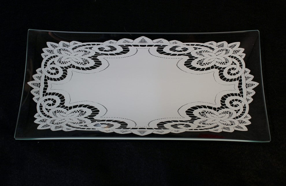 Behrenberg Glass Battenburg Lace plate set is a simple and elegant combination of rectangle and square dishes. This set of 6 is perfect for catering a small get together, or creating a great look to any table. Their set of Battenburg Lace plates are a solid lace design that has a classic white screen print design specialized by Behrenberg Glass Company. Behrenberg Glass lace plates are easy to collect and display. These plates are recommended to be hand washed. All glass is made in the USA. 6" x 12" rectangle platter. 8" x 14" rectangle platter. Four, 8" square plates.