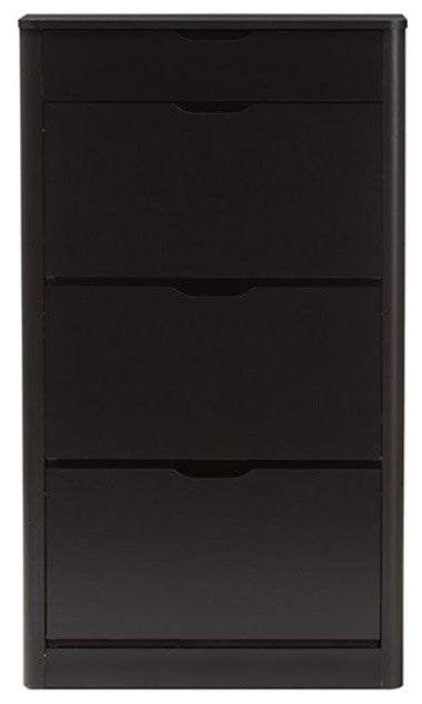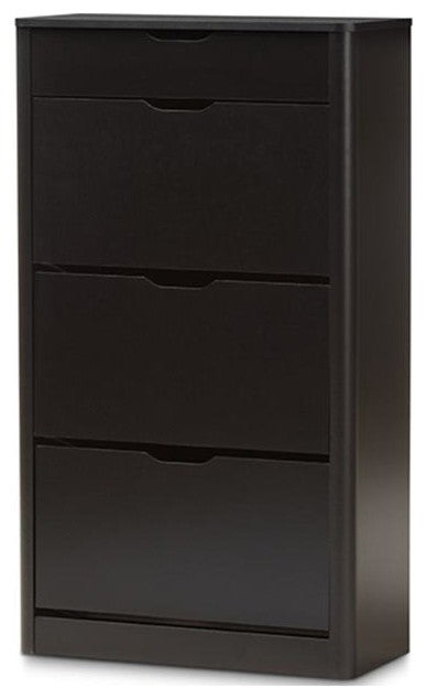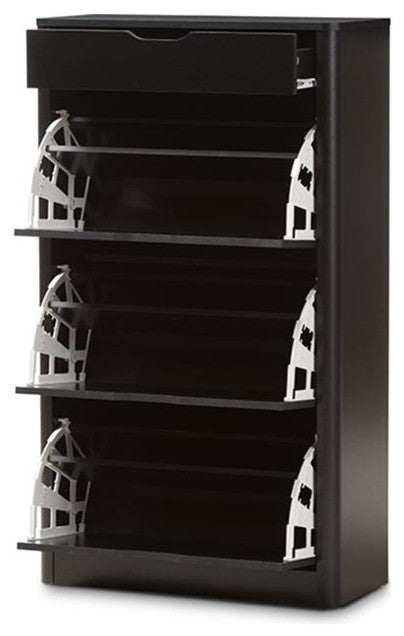 Baxton Studio Cayla Modern and Contemporary Black Wood Shoe CabinetUpdate your everyday organization with the smart design and spacious drawers of the Cayla black shoe cabinet. Constructed of durable engineered wood for a sturdy structure with black finish for lasting good looks, the Cayla features soft-forming side panels outlook for a contemporary feel. One drawer space at the top is ideal for storing spare knick-knacks, deodorizers, and shoe-shine polishes. Three drawers with fold-down doors reveal angled compartments to easily access your shoes. Store up to 12 pairs of shoes for your convenience. Perfect for your entrance or bedroom for keeping sneakers, heels, and flats under wraps. Made in Malaysia, the Cayla requires assembly.