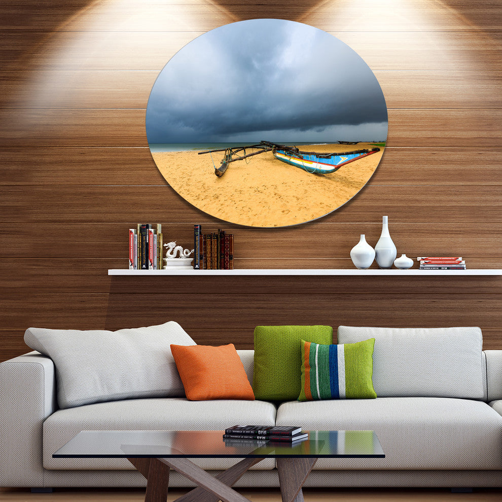 Bring Contemporary Abstraction to your home with this large Circle Metal wall art. This Beach with Dark Clouds above Ocean Metal Artwork makes it the focal point of any room or office.