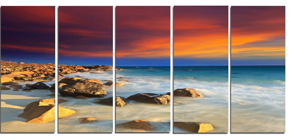 "Beach With Stones On Foreground" Seascape Art Canvas, 5 Panels, 60"x28"