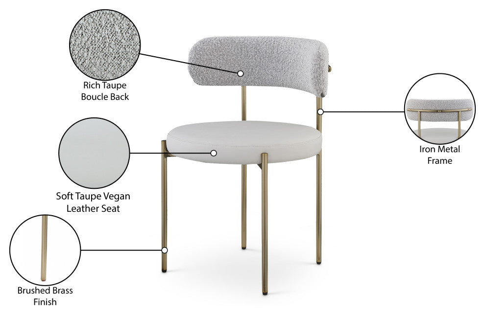 Beacon Dining Chair, Set of 2, Taupe, Vegan Leather and Boucle Fabric, Brushed Brass Finish