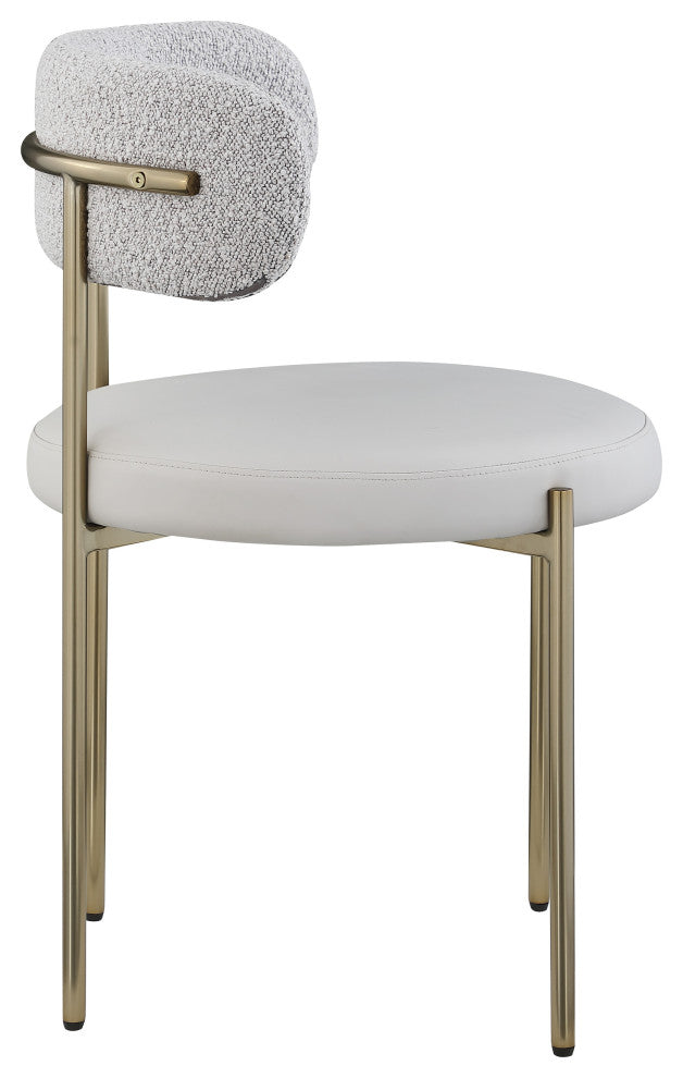 Give your dining room a modern boost with this Beacon vegan leather and boucle fabric dining chair. This pretty chair has the contemporary design elements you''re looking for, from its curvy back to its thickly padded seat and brushed brass-finished metal frame. Taupe vegan leather provides the look of the real thing without the maintenance requirements.Overall Product Dimensions: 22" W x 21" D x 30" HSoft Taupe Vegan Leather SeatRich Taupe Boucle BackBrushed Brass FinishIron Metal FrameSeat Dimensions: Seat Width: 20.5"Seat Height: 18.5"Seat Depth: 18.5"Back Height: 11.5"