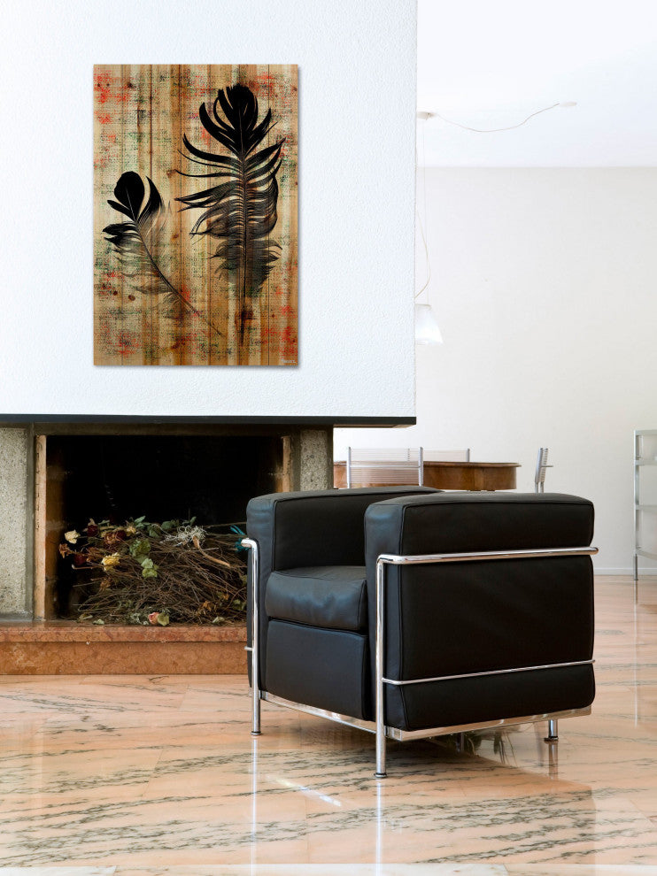 "Beautiful Black Feathers" Print on Natural Pine Wood, 30"x45"