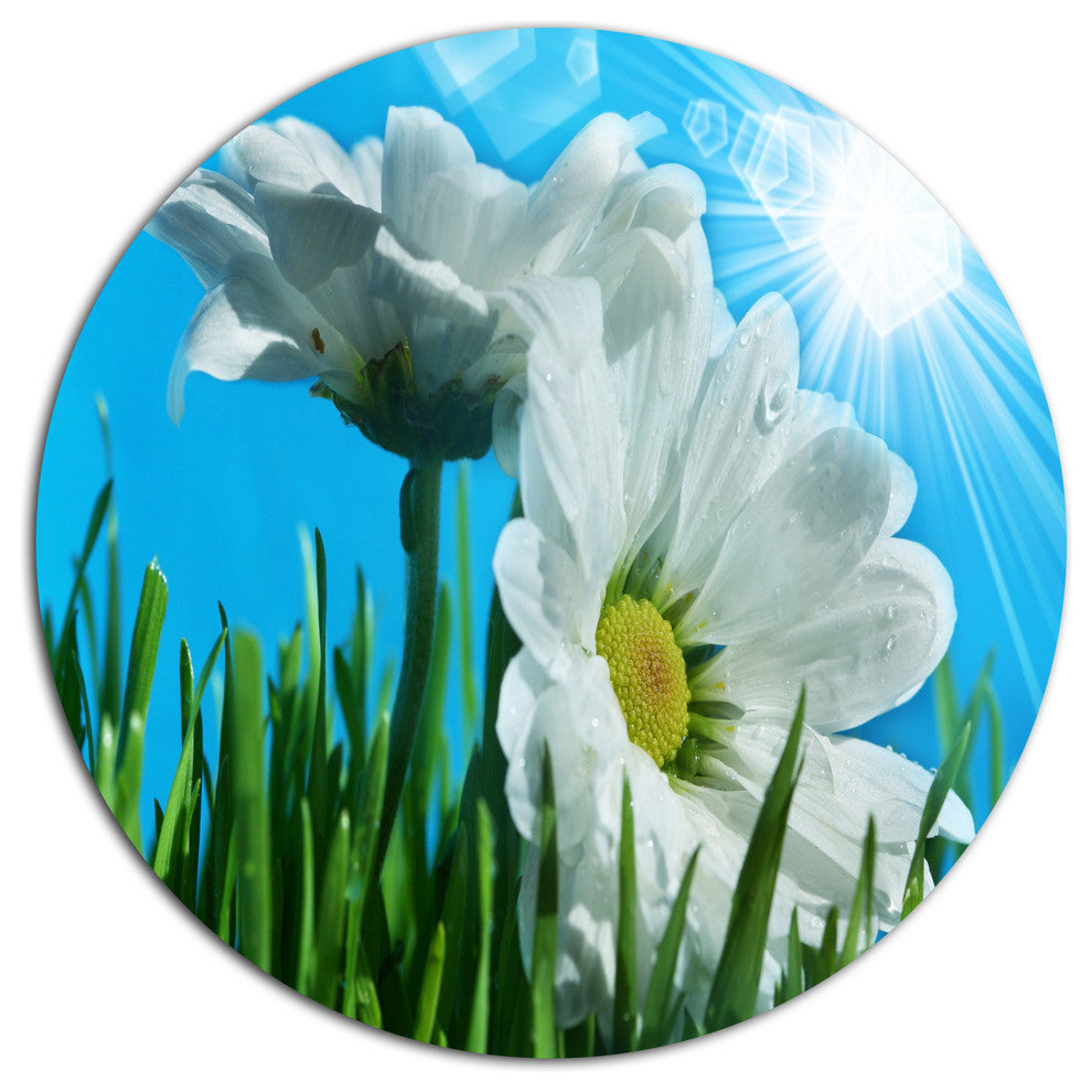 Bring Contemporary Abstraction to your home with this large Circle Metal wall art. This Beautiful Chamomiles in Bright Sunlight Metal Artwork makes it the focal point of any room or office.