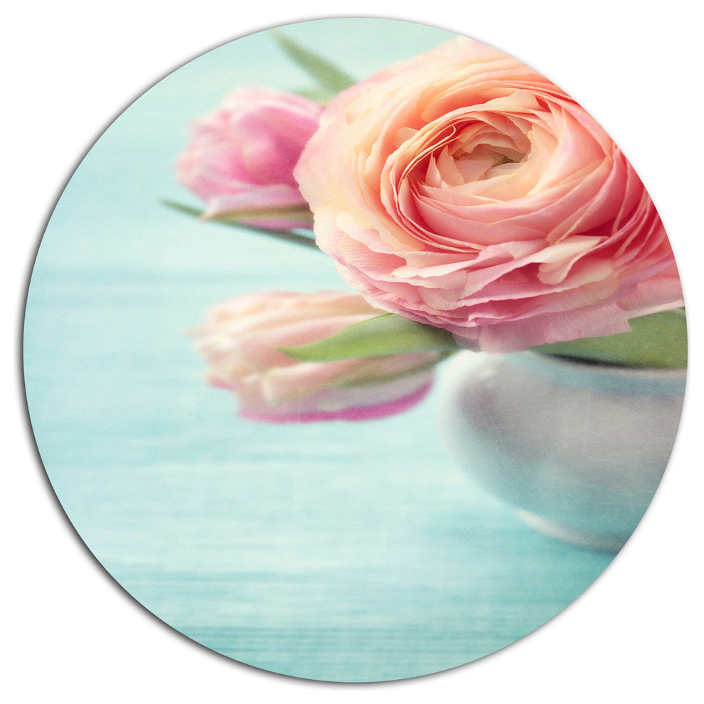 Beautiful Pink Flowers In Vase, Floral Disc Metal Artwork, 23"