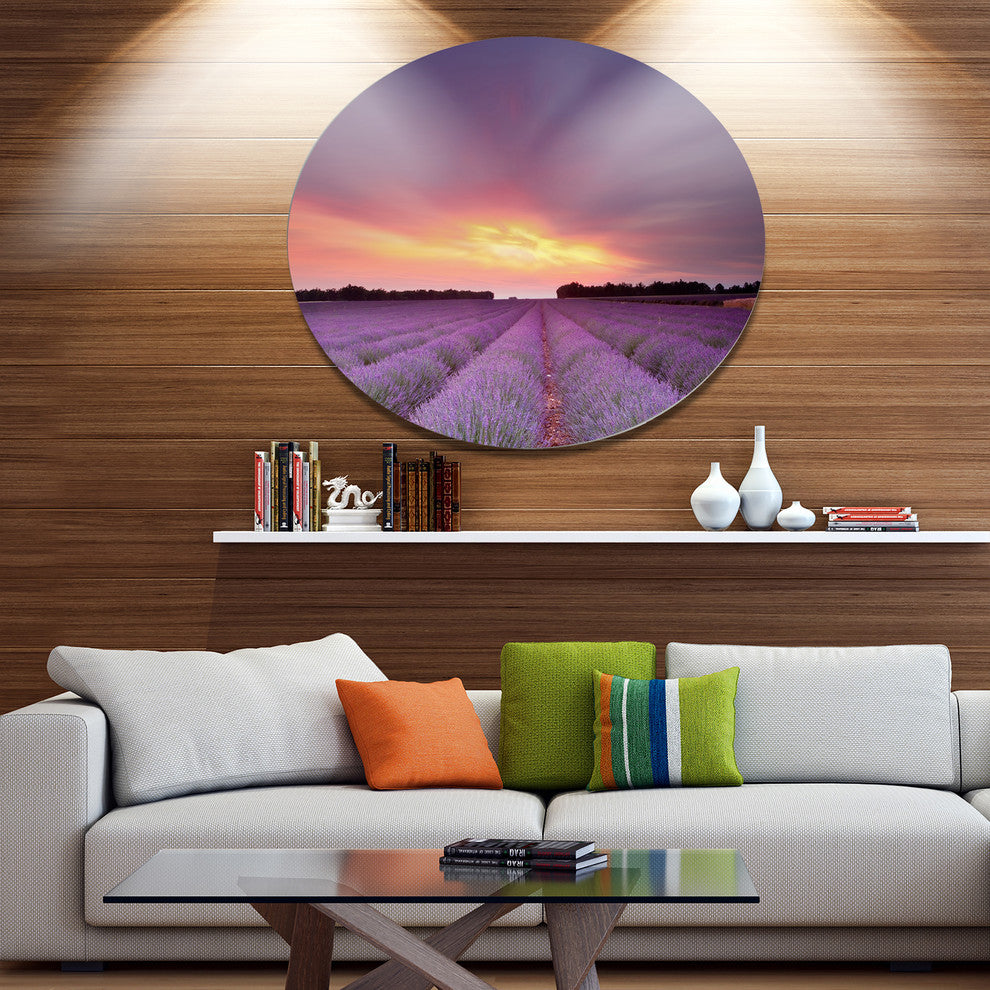 Bring Contemporary Abstraction to your home with this large Circle Metal wall art. This Beautiful Sunset over Lavender Rows Metal Artwork makes it the focal point of any room or office.
