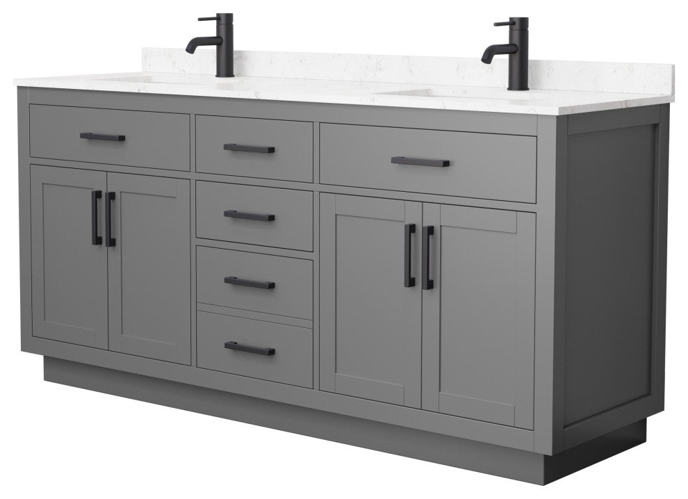 Fantastic value and classic design. The elegant Beckett vanity has it all, with quality touches like brushed or matte metal hardware accents, dovetailed drawers, cultured marble counters and soft-close doors and drawers. Ample storage and a double-depth lower drawer give you plenty of room for those bathroom necessities. Do your bathroom right, with the beautiful Beckett vanity series. Manufacturing Model #: WCG262672DGBCCUNSMXXPRODUCT FEATURES:• Constructed of environmentally friendly, high grade solid wood, plywood, and MDF, engineered to prevent warping and last a lifetime. 12-stage wood preparation, sanding, painting, and finishing process• Highly water-resistant low V.O.C. sealed finish. Beautiful transitional styling that complements any bathroom. Practical floor-standing design. Minimal assembly required. Deep Dovetailed drawers• Fully-extending undermount soft-close drawer slides. Concealed soft-close door hinges. Recessed toe kick. Countertop with porcelain undermount square sinks is drilled for single-hole faucet mounts. Faucet(s) not included• Carrara Cultured Marble countertop includes 3" backsplash and reversible sidesplash. Backsplash comes in 2 pieces (Cut from 1 single piece due to high probability of breakage)• Metal exterior hardware with matte black finish. Four (4) functional doors. Three (3) functional drawers. Plenty of storage and counter space. 2-Year Limited Warranty