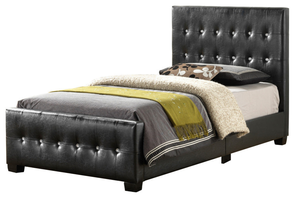 Jeweled Tufting Hiighlights this Modern Design Upholstered Bed. Both Headboard And Footboard are Accented with the Faux Jewel Button Tufting. The Faux Leather Cover is Durable and easy to Clean. Available in Twin, Full, Queen and King