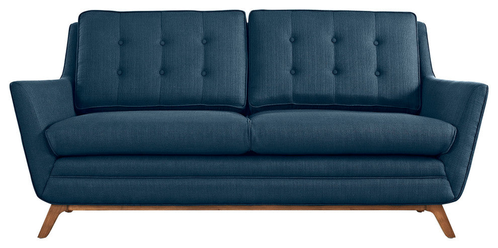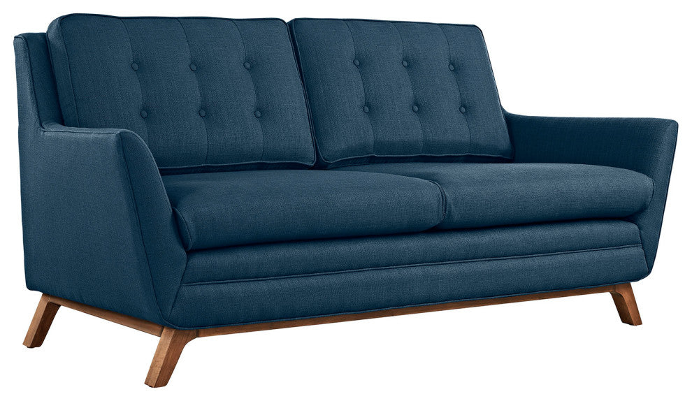 Dominate your d�cor with the expertly designed Beguile Collection. Exquisitely crafted with gently sloping arms, comfortable plush seat cushions, and adeptly tufted back cushion buttons, Beguile is a delightful collection that reinvents mid-century style. Outfitted with a solid wood walnut-stained base and fine fabric, Beguile comes perfect for living room, lounge and meeting areas. Set Includes: One - Beguile LoveseatWalnut Stained Beech Wood LegsPlastic Foot GlidesFinely Upholstered FabricSofa Weight Capacity - 1323 lbs.Assembly RequiredOverall Product Dimensions: 36"L x 71.5"W x 34.5"HSeat Dimensions: 23"L x 61.5"W x 19"HArmrest Dimensions: 24"HBackrest Dimensions: 15.5"HArmrest Height from Seat: 4.5"HCushion Thickness: 6"HBase Dimensions: 71.5"WProduct Weight: 72 LBsProduct Color: AzureProduct Material: Frame and leg is beech .; leg is KD structure with #411 color .; Seat cushion is 30KG/M3 density foam,; backrest is 28KGS/M3 density foam.; Plastic foot glide.