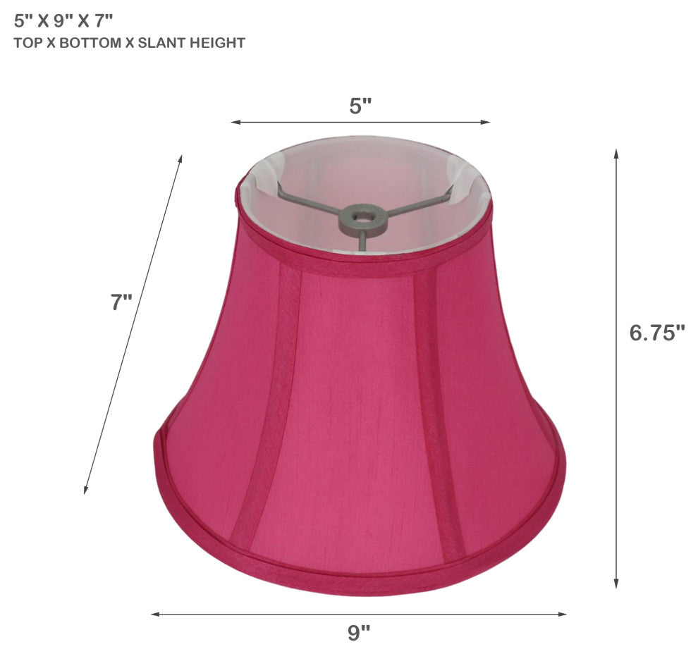 Urbanest faux silk bell lampshadeFaux silk bell with a brushed nickel spider fitter. Shade is fuchsia faux silk with white lining.Top diameter measures 5" across, bottom diameter measures 9" across and 7" slant height.Maximum recommended wattage is 60 watts. Bulb not included.List price is for 1 shade.