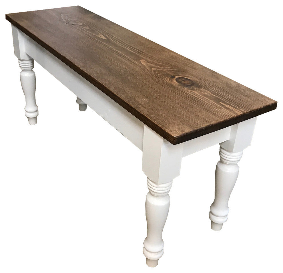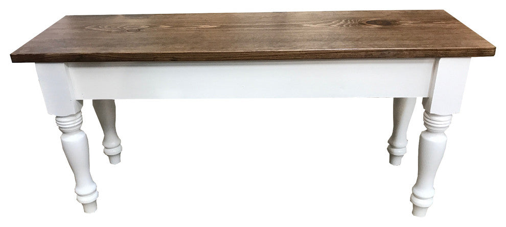 The Berkshire Farmhouse bench has a light walnut top and classic white base, with beautiful turned legs. This bench is made by hand to look great and stand up to the pressures of time.This bench would make a good entryway bench or look great paired with its matching table; the Berkshire Harvest.(For a bench that nests between the table legs order a bench that is 12" shorter)DESIGNA simple, rustic design the Berkshire Farmhouse bench is 100% solid wood.Handcrafted in the heartlandHand-applied multi-step durable satin polyurethane finish.Adjustable stay-level padded felt feet for added stability on uneven floors.Each piece is one of a kind.Simple assembly.SHIPPINGWe want you to enjoy your new bench as soon as possible. We custom craft each of our benches and they generally ship within 15-20 business days right to your front door.100% SOLID WOOD, HAND CRAFTEDNo particle board or cheap assembly practices here. We craft and assemble each one by hand and finish each with a hand-applied multi-step durable satin polyurethane finish. After ensuring that everything fits and looks just right we pack it for shipping.Grain / Color Notice Because our furniture is crafted from solid real wood there will be variation in color, and grain pattern. Products in the images have been crafted from the same species of wood and stained with the exact same stain color as the product you will receive. However because wood is a natural product no two pieces are the same. Depending on an individual piece of wood and grain pattern the stain may take more or less resulting in the color variation. While every effort has been made to supply you with the most accurate photographic representation, you should expect some variation in your product.