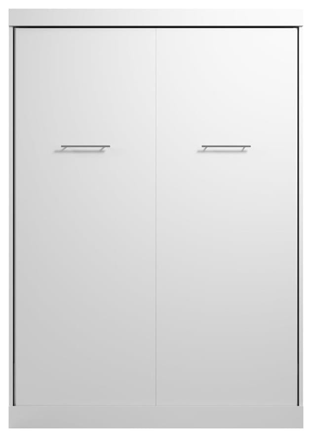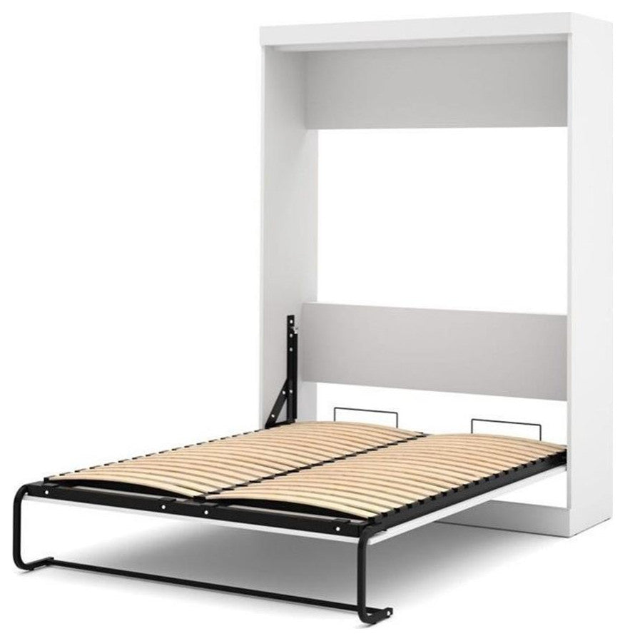 The Bestar Nebula 59W full Murphy bed presents an ideal solution for creating a multipurpose room with contemporary style. A dual piston system folds the full size Murphy bed down quickly and smoothly. The mattress support features flexible slats that absorb pressure for maximum comfort. The cabinet bed accepts most full size mattresses and is designed to be used without a box spring. The open bed extends 86.8 inches from the wall. To avoid risk of injury, the bed must be installed to the wall and floor structure by a professional or qualified person. Two people are required for assembly. Installation requires attachment to wood studs or masonry, removal of the baseboard, and drilling into the floor. Necessary hardware is included. Do not use this product for children or pets under 50 pounds (22.7 kg). Backed by a 10 Year Warranty. North American made with globally sourced materials.Features: • Material: Laminated engineered wood, steel metal • Finish: White • To avoid risk of injury, bed must be installed to wall and floor structure by a professional or qualified person; two people are required for assembly • Installation requires attachment to wood studs or masonry, removal of the baseboard, and drilling into the floor (if disassembly is required, holes may be covered with baseboards 0.5 inches or thicker); all necessary hardware is included • Dual-mount wall bed mechanism attaches to floor and wall for ease of assembly and maximum stability and durability • Do not use this product for children or pets under 50 pounds (22.7 kg); maximum weight supported with mattress is 1000 pounds (453.6 kg) • Full size Murphy bed accommodates most standard Full mattresses (8-10 inches thick, 60-90 lb, 54 x 75 inches, no futons) to let you choose the most comfortable option (mattress not included, do not use with box spring) • Dual piston system allows you to fold the space saving bed up and down smoothly and quickly • Mattress support uses flexible slats that follow the curves of the body and absorb pressure for maximum comfort • Durable steel wall bed frame and laminated engineered wood cabinet with leg levelers • Clean lines and brushed nickel handles complement the contemporary finish of your choice • Increased comfort due to Euroslat mattress support system. • Simple and safe dual piston system makes opening and closing user-friendly. • Easy to use; use the handle to pull the bed towards you to lower the bed and flip the leg down onto the floor. • For installation and to avoid risk of injury, use only a professional or qualified person with knowledge of the wall structure, studs, and components. • Bed may be attached to wood studs, metal studs, or masonry wall structures; masonry requires use of concrete screws (not provided).Specifications: • Product Dimensions: 83.66"H x 58.66"W x 86.83"D • Product Weight: 326.8 lbs • Product Height: (Minimum Ceiling Height of Anchoring Wall) 85.8" • Product Dimensions: (Clearance of Under the Bed When It Is Open) 9.6" • Warranty Description: Backed by the Bestar 10 year manufacturer''s • Box Spring/ Foundation Required: No