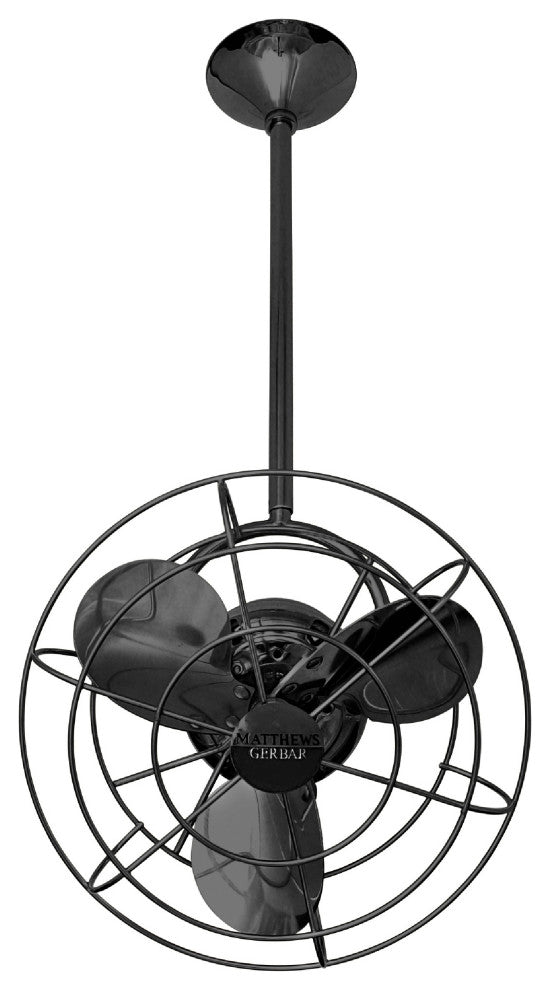 Unique and versatile, the fan head of the Bianca Direcional ceiling fan can be infinitely positioned in a 180-degree arc, forward and reverse, to provide maximum, directional airflow. The Bianca can be hung in small, awkward spaces or in front of HVAC ducts to make more efficient the heating, ventilation or air conditioning of any space.Features: Constructed of cast aluminum, heavy spun and stamped steel, this fan carries a limited lifetime warranty.Each unique motor mount and fan head knob is made of genuine marbleized Bakelite.Made in Brazil. Assembled and tested with care in the USA.Decora-style 3-speed wall switch in white.Includes 10" field cuttable downrod. Downrods can be easily field cut; they are not threaded. Can be installed with a maximum 30" downrod.Flat ceiling canopy. Not compatible with vaulted ceiling canopy.All Matthews Gerbar fans are hand made and not mass produced.Safety cages available for low ceiling applications (sold separately).Fan Head is Infinitely Adjustable 180 Degrees in Forward and Reverse PositionsMatthews-Gerbar fans do not oscillate on their own. The fan heads can be pivoted to change the direction.