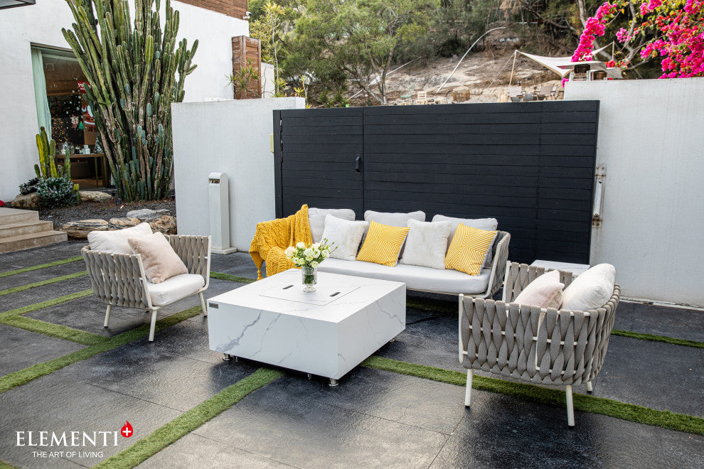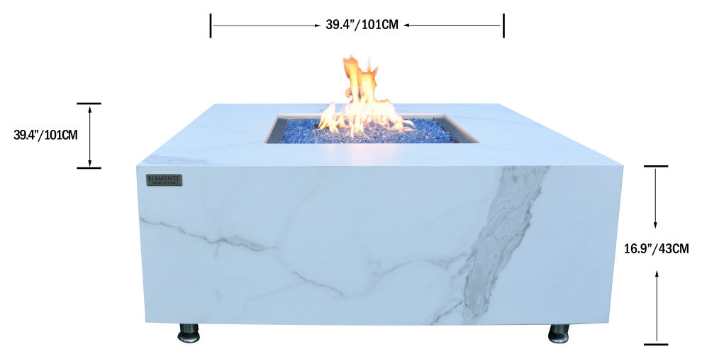 The Elementi Bianco White Marble Porcelain Fire table is a masterfully crafted outdoor fire feature, possessing a modern and tasteful design that seamlessly integrates with any outdoor living space. With a stainless-steel 12" burner ring, 40" x 40" tabletop surface, electronic ignition with auto safety shut-off, and your choice of a natural gas or propane fuel system, the Sofia truly is the ultimate entertainment feature. Relax by the fireside to create unforgettable memories with friends, or simply enjoy the delicate dancing of the gas-powered flames on peaceful evenings alone. Due to the forward-thinking of the precision engineers at Elementi, the Bianco White Marble fire table is wind, water, and impact resistant - to ensure your fire feature maintains quality long after the initial purchase. Nevertheless, the impressive table includes a canvas cover, to secure the feature during winter months or poor weather conditions. The Elementi Bianco White Marble Porcelain Fire table will provide significant heat whilst adding to the ambiance of your surroundings with its aesthetically pleasing flames and glowing coals. Comes complete with a weatherproof cover for winter. Brighten up your quality of life with a backyard fire pit as your outdoor centerpiece that will have the reflections of dancing flames keeping you and your loved ones warm and cozy. - Body construction: Marble porcelain and metal frame - Burner ring size: 12 inch / 30.5 cm diameter - Burner ring construction: 16 gauge, 304 stainless steel - Burner pan size: 20.4 x 20.4 x 2.2 inch / 51.8 x 51.8 x 5.5 cm - Burner pan construction: 16 gauge, 304 stainless steel - Control system: Push button spark ignition system - Maximum heat output: 60,000 BTUs for CSA / 16 KW (55,000 BTUs) for CE & UKCA - Certification: CSA & CE & UKCA Certified - Warranty: 2 years