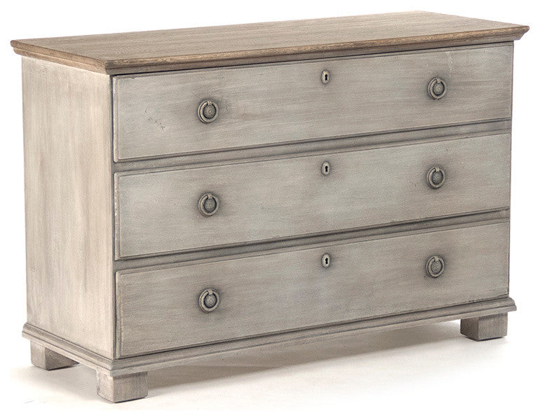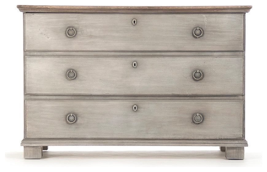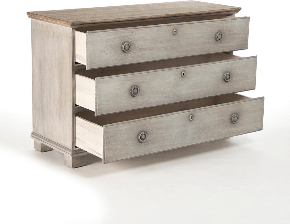 Three drawer dresser with ring handles in white wash finish and weathered top.