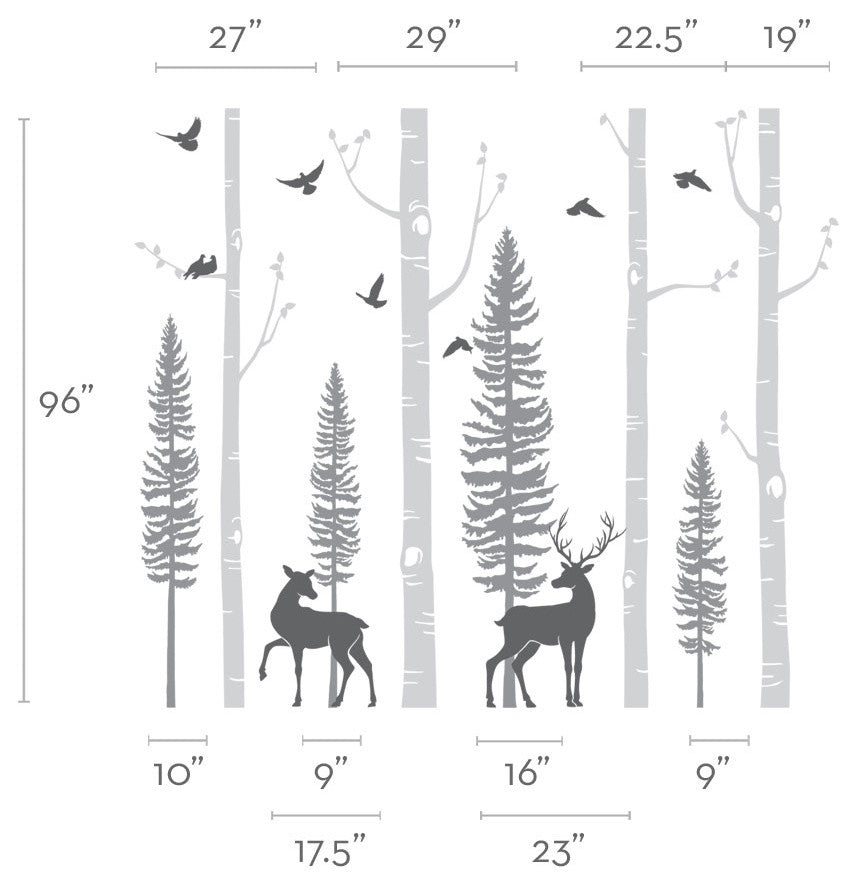 • •  The tree decal is made to be trimmed on either the top or bottom to fit your wall perfectly. Size: Large Birch Tree Size (approx): (starting left) (Total width will vary based on how you choose to place the trees.)Tree Size (approx): (starting left) Tree 1: 27"w x 108"h (68 cm x 274 cm)Tree 2: 29"w x 108"h (73.5 cm x 274 cm)Tree 3: 22.5"w x 108"h (57 cm x 274 cm)Tree 4: 19"w x 108"h (48 cm x 274 cm)Pine Tree Size (approx): (starting left) Tree 1: 10"w x 63"h Tree 2: 9"w x 55.5"h Tree 3: 16"w x 77"h Tree 4: 9"w x 43"h Large Deer Size (approx): 23"w x 34"hSmall Deer Size (approx): 17.5"w x 23"hWhats Included: 4 Birch Trees with Leaves4 Pine Trees8 Birds2 DeerApplication ToolDetailed Step by Step Instructionsadditional information: The trees, branches, birds and deer are all separate decals so you can arrange them anyway you like!
