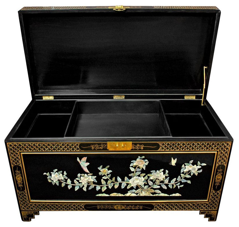 Hand crafted in a small, family-owned workshop of traditional artisans in Guangdong, this fine lacquer trunk exudes timeless elegance and exquisite craftsmanship, reflecting centuries of artistry passed down through the generations. The front, lid, and side panels have been decorated with delicately hand-carved mother of pearl, and hand-painted designs run along the edges. The fully finished interior contains a removable shelf box for added versatility.