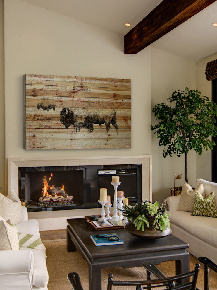 "Bison Herd Walk" Painting Print on Natural Pine Wood, 45"x30"