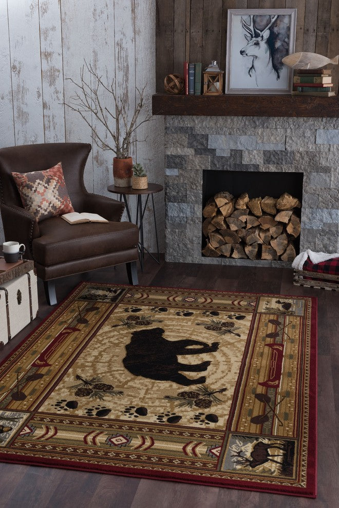 Black Bear Novelty Lodge Pattern Red Rectangle Area Rug, 4'x5'