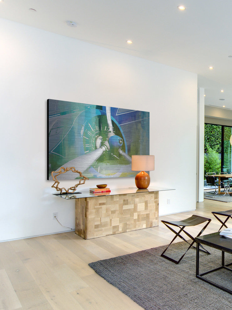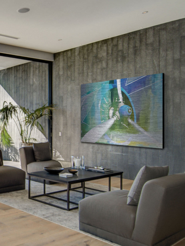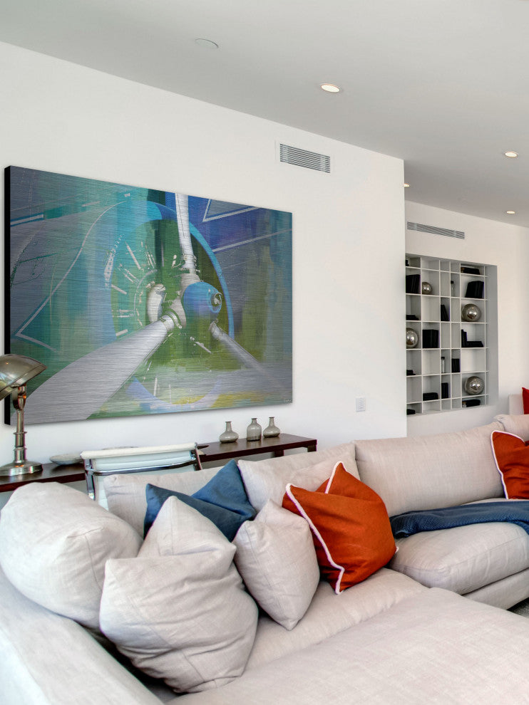 Striking and unique, the "Blades" UV Ink Print on Brushed Aluminum by Parvez Taj will bring your walls to life. Printed on aluminum, this 45 inch wide by 30 inch tall contemporary artwork will make a statement in any living room, dining room, or bedroom.- Fine art UV ink print on brushed aluminum by Parvez Taj- The aluminum pops the colors and creates an iridescent shimmer, which gives depth to a room- Arrives ready to hang - Includes a certificate of authenticity- Artist signature on the front