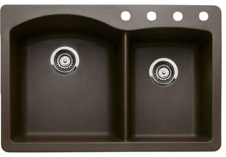 Blanco 440213 Diamond Silgranit II Drop-In 1-3/4 Bowl Sink (Cafe Brown). This unique double-bowl sink perfectly combines beautiful styling with ultimate durability. This sink is constructed of 80-percent solid granite, and is heat-resistant up to 536-degrees. It''s amazing surface is resistant to scratches, stains, and all household acids and alkali solutions. It features a larger bowl depth of 9-1/2", and a smaller bowl depth of 8". This model comes in a beautiful, Cafe Brown finish.Features:Available in 8 classic colors including our new Cinder.Required outside cabinet: 33"Drains NOT included.Bowl Depths: 9-1/2" & 8"Cutout Size: Template provided with approximate 1/8" reveal80% Solid graniteHeat resistant up to 536?FUnsurpassed cleanability backed by industry leading 7 patents!Resistant to scratches, stains and all household acids and alkali SolutionsLimited lifetime warranty
