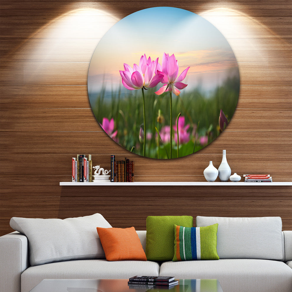 Bring Contemporary Abstraction to your home with this large Circle Metal wall art. This Blooming Lotus Flowers at Sunset Metal Artwork makes it the focal point of any room or office.