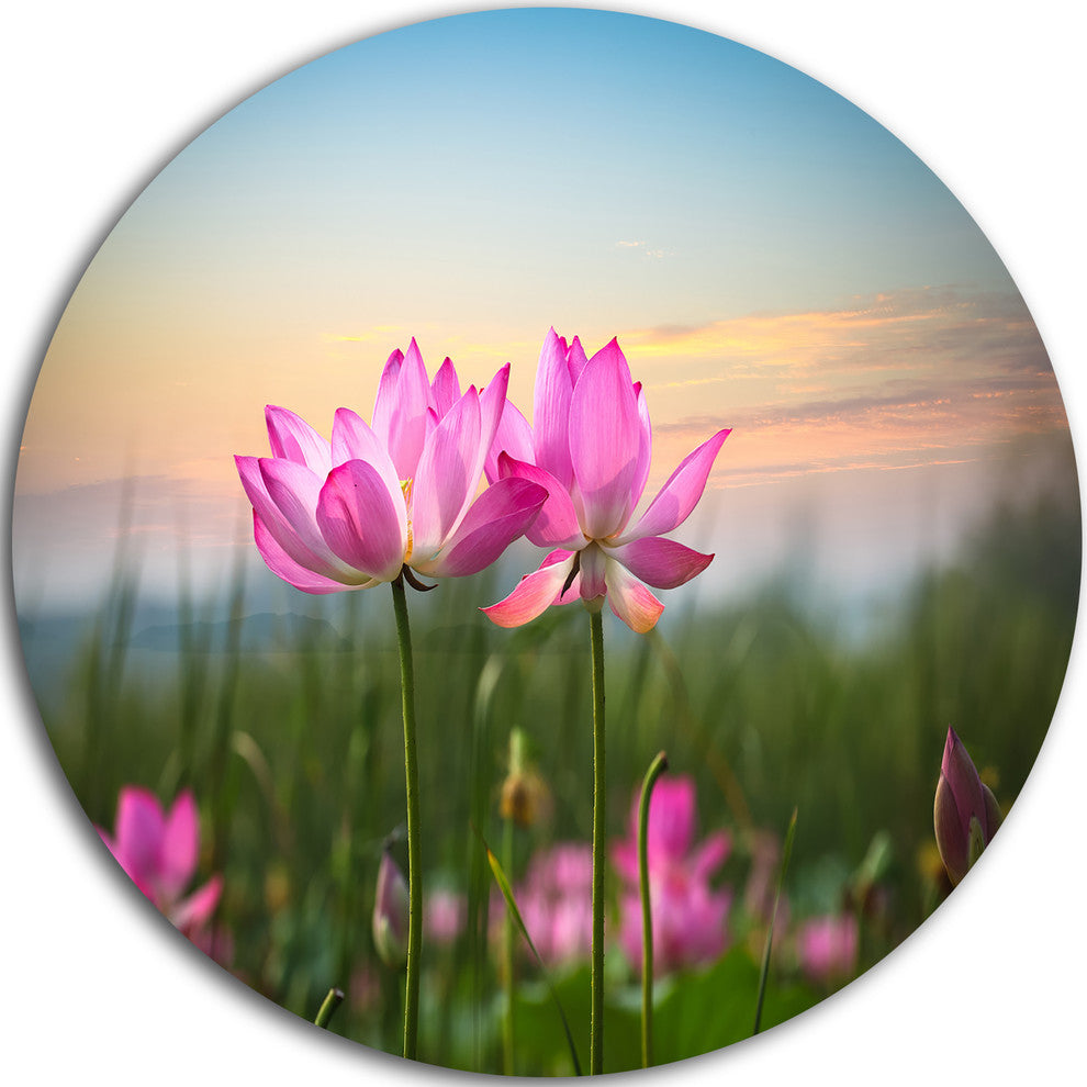 Blooming Lotus Flowers At Sunset, Floral Photo Round Wall Art, 11"