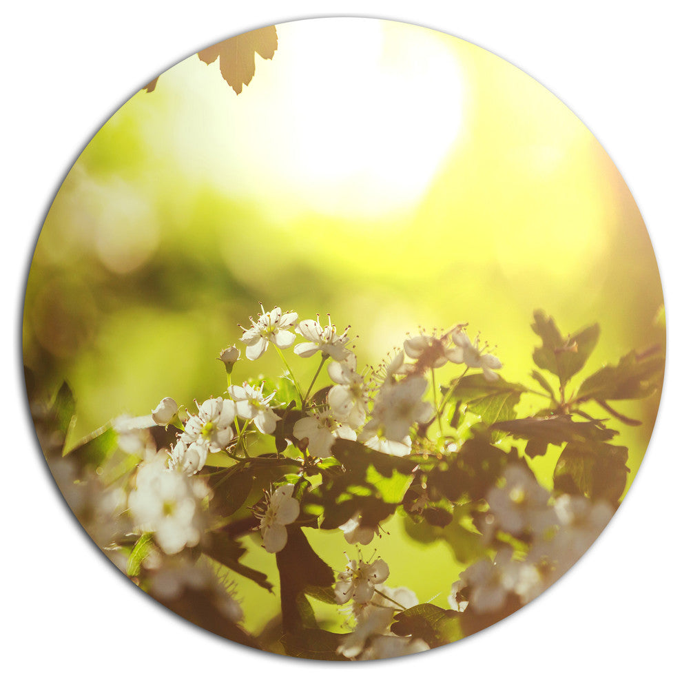Bring Contemporary Abstraction to your home with this large Circle Metal wall art. This Blossom Cherry on Green Background Metal Artwork makes it the focal point of any room or office.