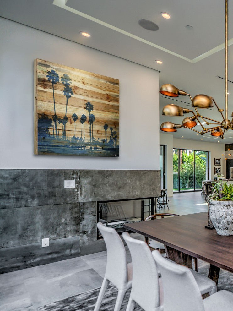 "Blue Palms" Print on Natural Pine Wood, 40"x40"