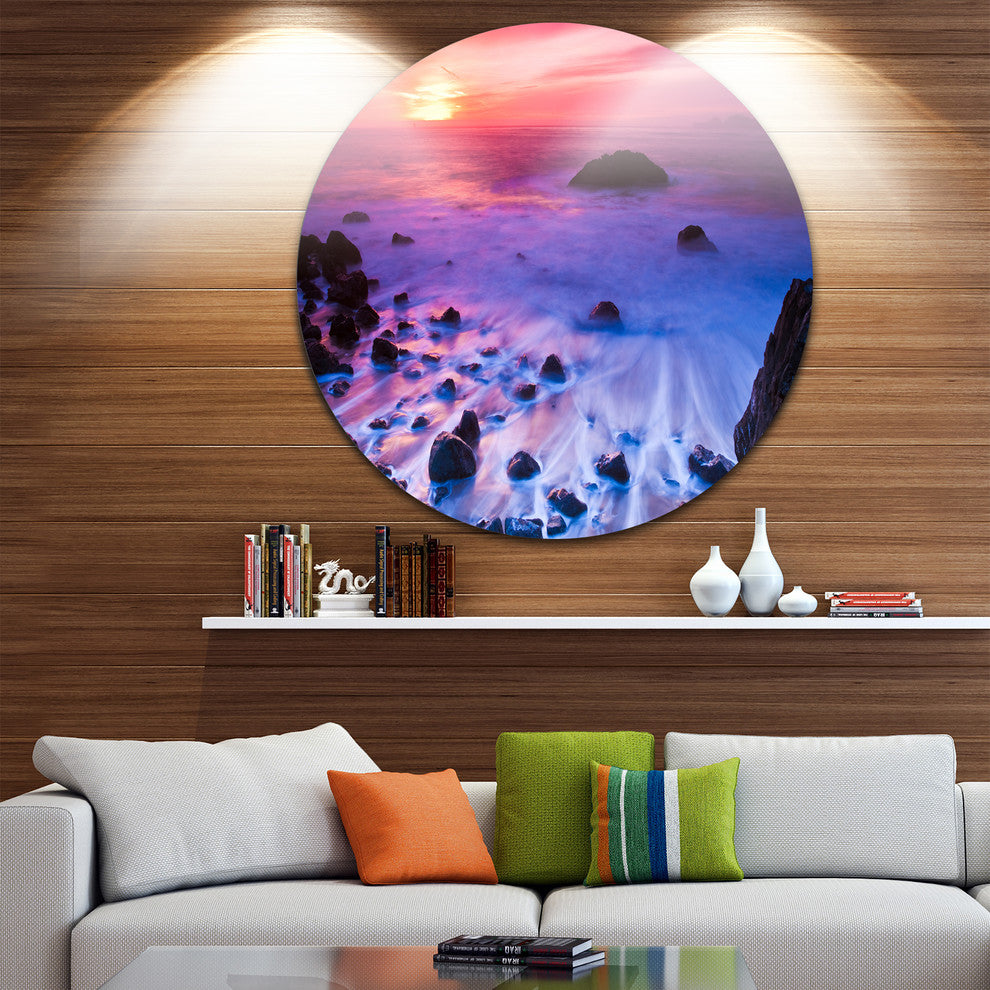 Bring Contemporary Abstraction to your home with this large Circle Metal wall art. This Bluish Waters at Sunset Panorama Metal Artwork makes it the focal point of any room or office.