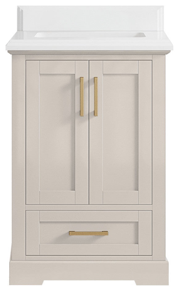 Willow Collection Boston 24 x22 Single Sink Bath Vanity in Fine Grain with 1.5" Cove Edge White QuartzThe Boston collection features a traditional design bathroom vanity that is both stylish and functional. The vanity is available in Navy Blue, White, Gray and Green colors, and it features soft-close doors and drawers for a smooth, quiet operation. The solid wood frame construction ensures durability, while the dovetail joint adds a touch of craftsmanship. The Boston collection is an excellent choice for any bathroom. This Boston vanity features a handy power plug and hairdryer holder that is available in sizes starting from 42 up to 84 in. The power plug features two USB ports, so you can charge your phones or use them to operate your hairdryer. The hairdryer holder is specially designed to fit most standard hairdryers. With its stylish design and practical features, this vanity is a great addition to any bathroom.Details:Material: Birch Wood and Plywood (NO MDF or PRESSBOARD)Finish Available: Elephant Skin Gray, Evergreen, Navy Blue, White, Pewter Green, Fine Grain and AlabasterNumber of Drawers: 1 Tip Out Drawer, 1 ShelfSink Installation: Under-mounted rectangle SINK(S)Hardware: Soft closing hinges and slider Hardware Finish : Brushed NickelCabinet Width: 23 (in.)Cabinet Depth: 21-1/2 (in.)Countertop Width: 24 (in.) Countertop Depth: 22 (in.)Cabinet Height: 34 (in.)Countertop Height: 1.5 (in.) Double Cove Edge or 2 (in.) Straight/ Mitered EdgeCabinet Height with Top: 36 (in.)Backsplash Height: 4 (in.)Faucet: NOT IncludedFaucet Hole(S): Comes with SINGLE hole faucetVanity Countertops options: Mitered /Straight edge or Double Cove Edge (White Quartz, Calacatta Laza Quartz, Calacatta Nuvo Quartz, Carrara Quartz, Empira Quartz, Carrara Marble, Piatra Gray Quartz, Pearl Light Gray Quartz, Venatino Quartz, Calacatta Gold Quartz, Calacatta Black Quartz)