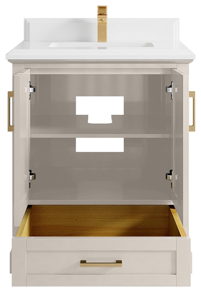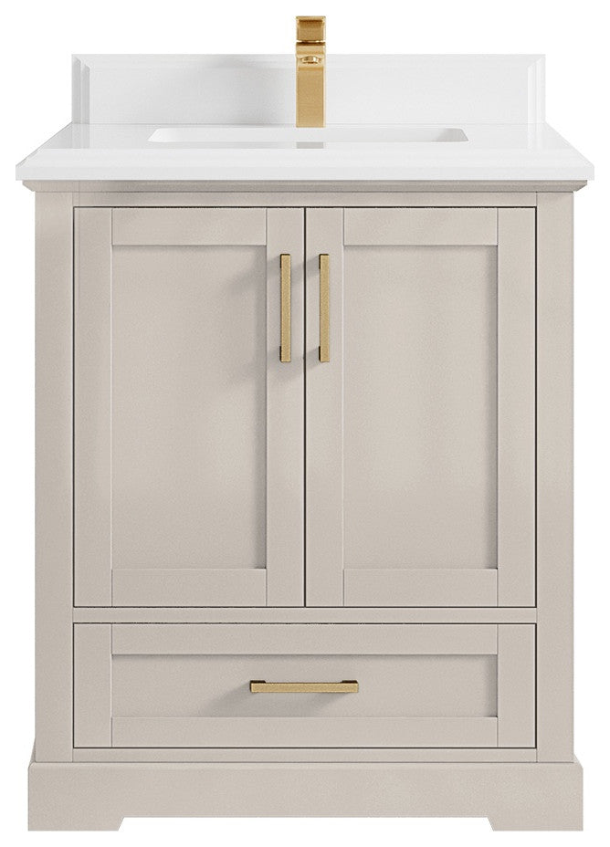 Willow Collection Boston 30 x 22 Single Sink Bath Vanity in Fine Grain with 1.5" Cove Edge White QuartzThe Boston collection features a traditional design bathroom vanity that is both stylish and functional. The vanity is available in Navy Blue, White, Gray and Green colors, and it features soft-close doors and drawers for a smooth, quiet operation. The solid wood frame construction ensures durability, while the dovetail joint adds a touch of craftsmanship. The Boston collection is an excellent choice for any bathroom. This Boston vanity features a handy power plug and hairdryer holder that is available in sizes starting from 42 up to 84 in. The power plug features two USB ports, so you can charge your phones or use them to operate your hairdryer. The hairdryer holder is specially designed to fit most standard hairdryers. With its stylish design and practical features, this vanity is a great addition to any bathroom.Details:Material: Birch Wood and Plywood (NO MDF or PRESSBOARD)Finish Available: Elephant Skin Gray, Evergreen, Navy Blue, White, Pewter Green, Fine Grain and AlabasterNumber of Drawers: 1 Tip Out Drawer, 1 ShelfSink Installation: Under-mounted rectangle SINK(S)Hardware: Soft closing hinges and slider Hardware Finish : Brushed NickelCabinet Width: 29 (in.)Cabinet Depth: 21-1/2 (in.)Countertop Width: 30 (in.) Countertop Depth: 22 (in.)Cabinet Height: 34 (in.)Countertop Height: 1.5 (in.) Double Cove Edge or 2 (in.) Straight/ Mitered EdgeCabinet Height with Top: 36 (in.)Backsplash Height: 4 (in.)Faucet: NOT IncludedFaucet Hole(S): Comes with SINGLE hole faucetVanity Countertops options: Mitered /Straight edge or Double Cove Edge (White Quartz, Calacatta Laza Quartz, Calacatta Nuvo Quartz, Carrara Quartz, Empira Quartz, Carrara Marble, Piatra Gray Quartz, Pearl Light Gray Quartz, Venatino Quartz, Calacatta Gold Quartz, Calacatta Black Quartz)