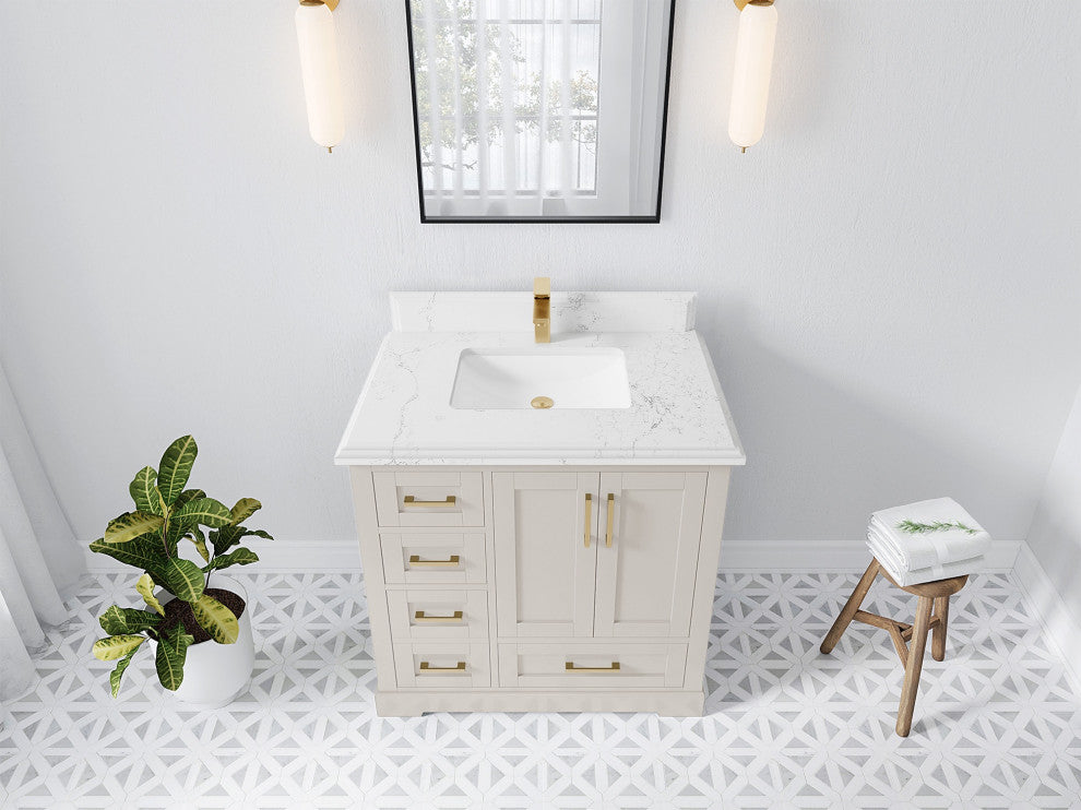 Willow Collection Boston 36 x 22 Center Single Sink with Right Side Bath Vanity in Fine Grain with 1.5" Cove Edge Empira QuartzThe Boston collection features a traditional design bathroom vanity that is both stylish and functional. The vanity is available in Navy Blue, White, Gray and Green colors, and it features soft-close doors and drawers for a smooth, quiet operation. The solid wood frame construction ensures durability, while the dovetail joint adds a touch of craftsmanship. The Boston collection is an excellent choice for any bathroom. This Boston vanity features a handy power plug and hairdryer holder that is available in sizes starting from 42 up to 84 in. The power plug features two USB ports, so you can charge your phones or use them to operate your hairdryer. The hairdryer holder is specially designed to fit most standard hairdryers. With its stylish design and practical features, this vanity is a great addition to any bathroom.Details:Material: Birch Wood and Plywood (NO MDF or PRESSBOARD) Finish Available: Elephant Skin Gray, Evergreen, Navy Blue, White, Pewter Green, Fine Grain and AlabasterNumber of Drawers: 3 Regular Drawers, 1 DOUBLE DRAWER WITH POWER PLUG AND ACCESSORIES (DEEP), 1 ShelfSink Installation: Under-mounted rectangle SINK(S)Hardware: Soft closing hinges and slider Hardware Finish : Brushed NickelCabinet Width: 35 (in.)Cabinet Depth: 21-1/2 (in.)Countertop Width: 36 (in.) Countertop Depth: 22 (in.)Cabinet Height: 34 (in.)Countertop Height: 1.5 (in.) Double Cove Edge or 2 (in.) Straight/ Mitered EdgeCabinet Height with Top: 36 (in.)Backsplash Height: 4 (in.)Faucet: NOT IncludedFaucet Hole(S): Comes with SINGLE hole faucetVanity Countertops options: Mitered /Straight edge or Double Cove Edge (White Quartz, Calacatta Laza Quartz, Calacatta Nuvo Quartz, Carrara Quartz, Empira Quartz, Carrara Marble, Piatra Gray Quartz, Pearl Light Gray Quartz, Venatino Quartz, Calacatta Gold Quartz, Calacatta Black Quartz)