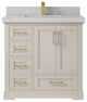 Willow Collection Boston 36 x 22 Center Single Sink with Right Side Bath Vanity in Fine Grain with 2" Straight/ Mitered Edge Pearl Light Gray QuartzThe Boston collection features a traditional design bathroom vanity that is both stylish and functional. The vanity is available in Navy Blue, White, Gray and Green colors, and it features soft-close doors and drawers for a smooth, quiet operation. The solid wood frame construction ensures durability, while the dovetail joint adds a touch of craftsmanship. The Boston collection is an excellent choice for any bathroom. This Boston vanity features a handy power plug and hairdryer holder that is available in sizes starting from 42 up to 84 in. The power plug features two USB ports, so you can charge your phones or use them to operate your hairdryer. The hairdryer holder is specially designed to fit most standard hairdryers. With its stylish design and practical features, this vanity is a great addition to any bathroom.Details:Material: Birch Wood and Plywood (NO MDF or PRESSBOARD) Finish Available: Elephant Skin Gray, Evergreen, Navy Blue, White, Pewter Green, Fine Grain and AlabasterNumber of Drawers: 3 Regular Drawers, 1 DOUBLE DRAWER WITH POWER PLUG AND ACCESSORIES (DEEP), 1 ShelfSink Installation: Under-mounted rectangle SINK(S)Hardware: Soft closing hinges and slider Hardware Finish : Brushed NickelCabinet Width: 35 (in.)Cabinet Depth: 21-1/2 (in.)Countertop Width: 36 (in.) Countertop Depth: 22 (in.)Cabinet Height: 34 (in.)Countertop Height: 1.5 (in.) Double Cove Edge or 2 (in.) Straight/ Mitered EdgeCabinet Height with Top: 36 (in.)Backsplash Height: 4 (in.)Faucet: NOT IncludedFaucet Hole(S): Comes with SINGLE hole faucetVanity Countertops options: Mitered /Straight edge or Double Cove Edge (White Quartz, Calacatta Laza Quartz, Calacatta Nuvo Quartz, Carrara Quartz, Empira Quartz, Carrara Marble, Piatra Gray Quartz, Pearl Light Gray Quartz, Venatino Quartz, Calacatta Gold Quartz, Calacatta Black Quartz)