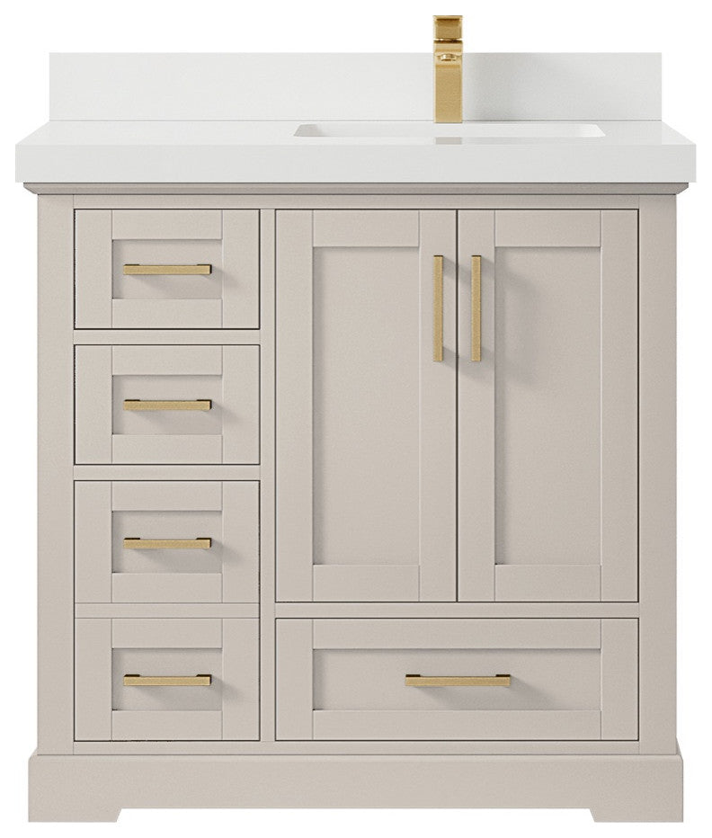 Willow Collection Boston 36 x 22 Right Offset Single Sink Bath Vanity in Fine Grain with 2" Straight/ Mitered Edge White Quartz The Boston collection features a traditional design bathroom vanity that is both stylish and functional. The vanity is available in Navy Blue, White, Gray and Green colors, and it features soft-close doors and drawers for a smooth, quiet operation. The solid wood frame construction ensures durability, while the dovetail joint adds a touch of craftsmanship. The Boston collection is an excellent choice for any bathroom. This Boston vanity features a handy power plug and hairdryer holder that is available in sizes starting from 42 up to 84 in. The power plug features two USB ports, so you can charge your phones or use them to operate your hairdryer. The hairdryer holder is specially designed to fit most standard hairdryers. With its stylish design and practical features, this vanity is a great addition to any bathroom.Details:Material: Birch Wood and Plywood (NO MDF or PRESSBOARD)Finish Available: Elephant Skin Gray, Evergreen, Navy Blue, White, Pewter Green, Fine Grain and AlabasterNumber of Drawers: 3 Regular Drawers, 1 DOUBLE DRAWER WITH POWER PLUG AND ACCESSORIES (DEEP), 1 ShelfSink Installation: Under-mounted rectangle SINK(S)Hardware: Soft closing hinges and sliderHardware Finish : Brushed NickelCabinet Width: 35 (in.)Cabinet Depth: 21-1/2 (in.)Countertop Width: 36 (in.) Countertop Depth: 22 (in.)Cabinet Height: 34 (in.)Countertop Height: 1.5 (in.) Double Cove Edge or 2 (in.) Straight/ Mitered EdgeCabinet Height with Top: 36 (in.)Backsplash Height: 4 (in.)Faucet: NOT IncludedFaucet Hole(S): Comes with SINGLE hole faucetVanity Countertops options: Mitered /Straight edge or Double Cove Edge (White Quartz, Calacatta Laza Quartz, Calacatta Nuvo Quartz, Carrara Quartz, Empira Quartz, Carrara Marble, Piatra Gray Quartz, Pearl Light Gray Quartz, Venatino Quartz, Calacatta Gold Quartz, Calacatta Black Quartz)