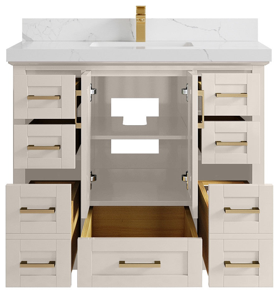Willow Collection Boston 42 x 22 Single Sink Bath Vanity in Fine Grain with 2" Straight/ Mitered Edge Calacatta Laza Quartz The Boston collection features a traditional design bathroom vanity that is both stylish and functional. The vanity is available in Navy Blue, White, Gray and Green colors, and it features soft-close doors and drawers for a smooth, quiet operation. The solid wood frame construction ensures durability, while the dovetail joint adds a touch of craftsmanship. The Boston collection is an excellent choice for any bathroom. This Boston vanity features a handy power plug and hairdryer holder that is available in sizes starting from 42 up to 84 in. The power plug features two USB ports, so you can charge your phones or use them to operate your hairdryer. The hairdryer holder is specially designed to fit most standard hairdryers. With its stylish design and practical features, this vanity is a great addition to any bathroom.Details:Material: Birch Wood and Plywood (NO MDF or PRESSBOARD) Finish Available: Elephant Skin Gray, Evergreen, Navy Blue, White, Pewter Green, Fine Grain and AlabasterNumber of Drawers: 5 Regular Drawers, 1 DOUBLE DRAWER WITH POWER PLUG AND ACCESSORIES (DEEP), 1 Regular Double Drawer (Deep), 1 ShelfSink Installation: Under-mounted rectangle SINK(S)Hardware: Soft closing hinges and slider Hardware Finish : Brushed NickelCabinet Width: 41 (in.)Cabinet Depth: 21-1/2 (in.)Countertop Width: 42 (in.) Countertop Depth: 22 (in.)Cabinet Height: 34 (in.)Countertop Height: 1.5 (in.) Double Cove Edge or 2 (in.) Straight/ Mitered EdgeCabinet Height with Top: 36 (in.)Backsplash Height: 4 (in.)Faucet: NOT IncludedFaucet Hole(S): Comes with SINGLE hole faucetVanity Countertops options: Mitered /Straight edge or Double Cove Edge (White Quartz, Calacatta Laza Quartz, Calacatta Nuvo Quartz, Carrara Quartz, Empira Quartz, Carrara Marble, Piatra Gray Quartz, Pearl Light Gray Quartz, Venatino Quartz, Calacatta Gold Quartz, Calacatta Black Quartz)