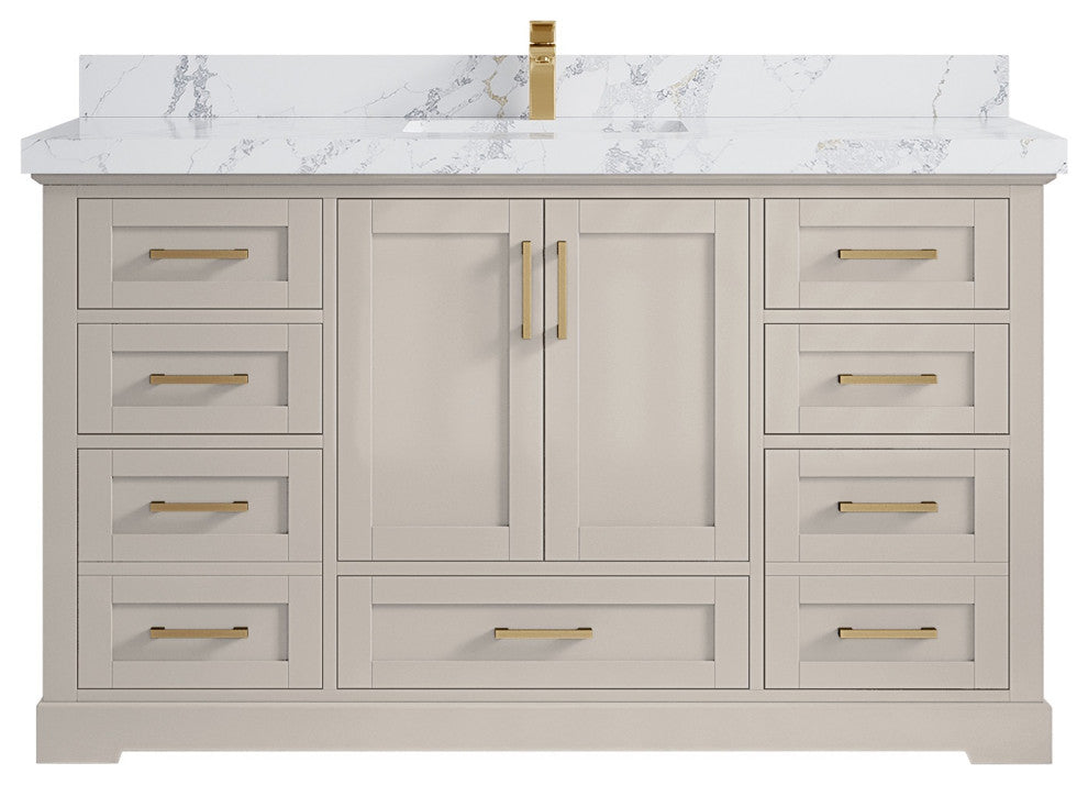 Willow Collection Boston 60 x 22 Single Sink Bath Vanity in Fine Grain with 2" Straight/ Mitered Edge Calacatta Poanazzo QuartzThe Boston collection features a traditional design bathroom vanity that is both stylish and functional. The vanity is available in Navy Blue, White, Gray and Green colors, and it features soft-close doors and drawers for a smooth, quiet operation. The solid wood frame construction ensures durability, while the dovetail joint adds a touch of craftsmanship. The Boston collection is an excellent choice for any bathroom. This Boston vanity features a handy power plug and hairdryer holder that is available in sizes starting from 42 up to 84 in. The power plug features two USB ports, so you can charge your phones or use them to operate your hairdryer. The hairdryer holder is specially designed to fit most standard hairdryers. With its stylish design and practical features, this vanity is a great addition to any bathroom.Details:Material: Birch Wood and Plywood (NO MDF or PRESSBOARD) Finish Available: Elephant Skin Gray, Evergreen, Navy Blue, White, Pewter Green, Fine Grain and AlabasterNumber of Drawers: 5 Regular Drawers, 1 DOUBLE DRAWER WITH POWER PLUG AND ACCESSORIES ( DEEP), 1 Regular Double Drawer (Deep), 1 ShelfSink Installation: Under-mounted rectangle SINK(S)Hardware: Soft closing hinges and slider Hardware Finish : Brushed NickelCabinet Width: 59 (in.)Cabinet Depth: 21-1/2 (in.)Countertop Width: 60 (in.) Countertop Depth: 22 (in.)Cabinet Height: 34 (in.)Countertop Height: 1.5 (in.) Double Cove Edge or 2 (in.) Straight/ Mitered EdgeCabinet Height with Top: 36 (in.)Backsplash Height: 4 (in.)Faucet: NOT IncludedFaucet Hole(S): Comes with SINGLE hole faucetVanity Countertops options: Mitered /Straight edge or Double Cove Edge (White Quartz, Calacatta Laza Quartz, Calacatta Nuvo Quartz, Carrara Quartz, Empira Quartz, Carrara Marble, Piatra Gray Quartz, Pearl Light Gray Quartz, Venatino Quartz, Calacatta Gold Quartz, Calacatta Black Quartz)