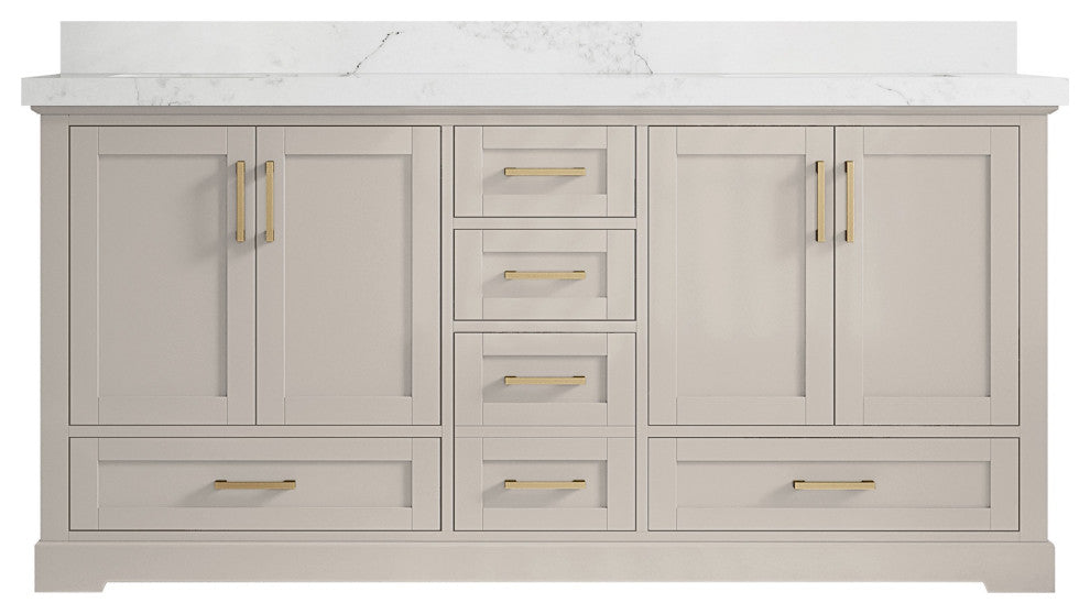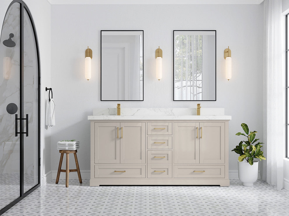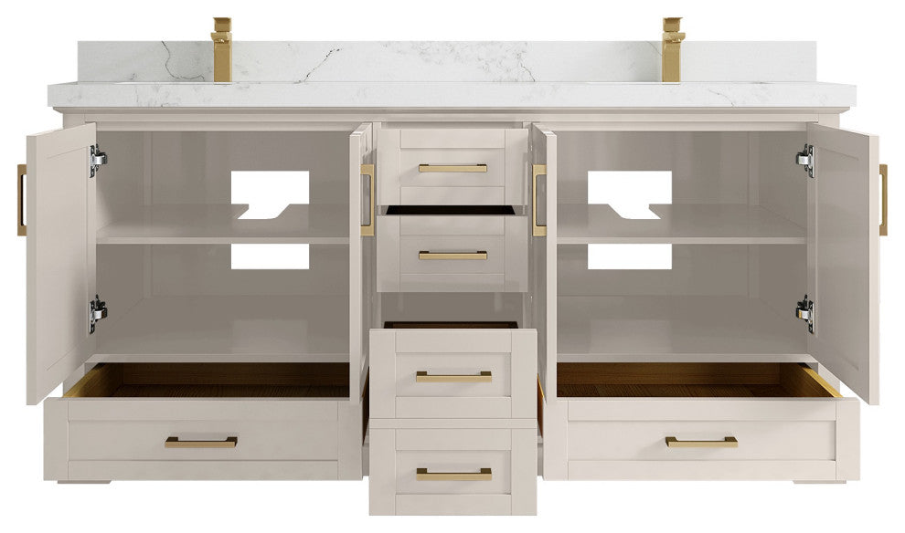 Willow Collection Boston 72 x 22 Double Sink Bath Vanity in Fine Grain with 2" Straight/ Mitered Edge Calacatta Nuvo QuartzThe Boston collection features a traditional design bathroom vanity that is both stylish and functional. The vanity is available in Navy Blue, White, Gray and Green colors, and it features soft-close doors and drawers for a smooth, quiet operation. The solid wood frame construction ensures durability, while the dovetail joint adds a touch of craftsmanship. The Boston collection is an excellent choice for any bathroom. This Boston vanity features a handy power plug and hairdryer holder that is available in sizes starting from 42 up to 84 in. The power plug features two USB ports, so you can charge your phones or use them to operate your hairdryer. The hairdryer holder is specially designed to fit most standard hairdryers. With its stylish design and practical features, this vanity is a great addition to any bathroom.Details:Material: Birch Wood and Plywood (NO MDF or PRESSBOARD) Finish Available: Elephant Skin Gray, Evergreen, Navy Blue, White, Pewter Green, Fine Grain and AlabasterNumber of Drawers: 4 Regular Drawers, 1 Double Drawer with Power Plug and Accessories (Deep), 2 ShelvesSink Installation: Under-mounted rectangle SINK(S)Hardware: Soft closing hinges and slider Hardware Finish : Brushed NickelCabinet Width: 71 (in.)Cabinet Depth: 21-1/2 (in.)Countertop Width: 72 (in.) Countertop Depth: 22 (in.)Cabinet Height: 34 (in.)Countertop Height: 1.5 (in.) Double Cove Edge or 2 (in.) Straight/ Mitered EdgeCabinet Height with Top: 36 (in.)Backsplash Height: 4 (in.)Faucet: NOT IncludedFaucet Hole(S): Comes with SINGLE hole faucetVanity Countertops options: Mitered /Straight edge or Double Cove Edge (White Quartz, Calacatta Laza Quartz, Calacatta Nuvo Quartz, Carrara Quartz, Empira Quartz, Carrara Marble, Piatra Gray Quartz, Pearl Light Gray Quartz, Venatino Quartz, Calacatta Gold Quartz, Calacatta Black Quartz)