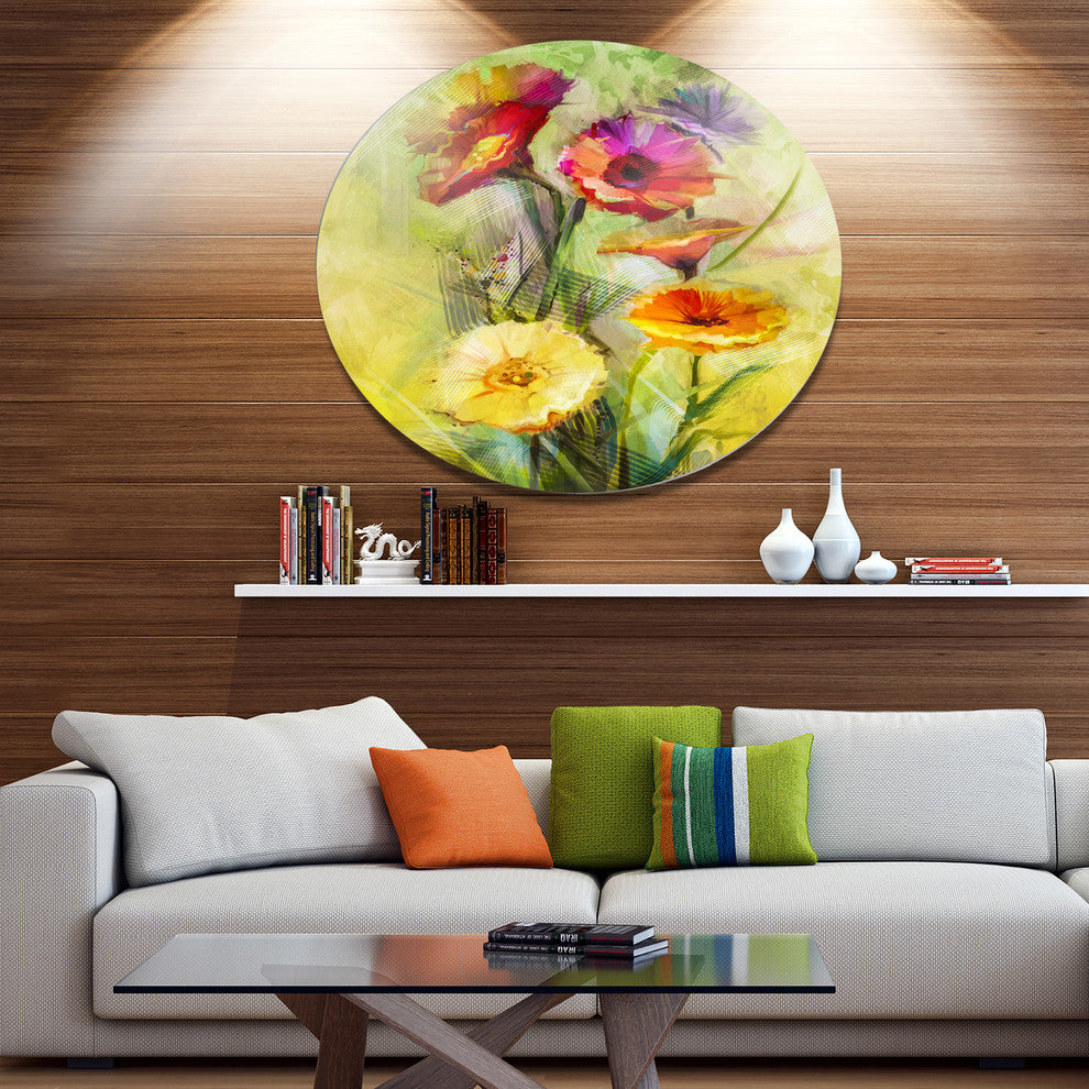 Bring Contemporary Abstraction to your home with this large Circle Metal wall art. This Bouquet of Gerbera Flowers Watercolor Metal Artwork makes it the focal point of any room or office.