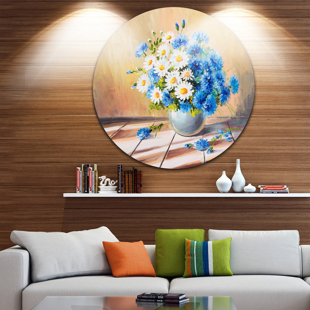 Bouquet On Wooden Table, Floral Disc Metal Artwork, 11"