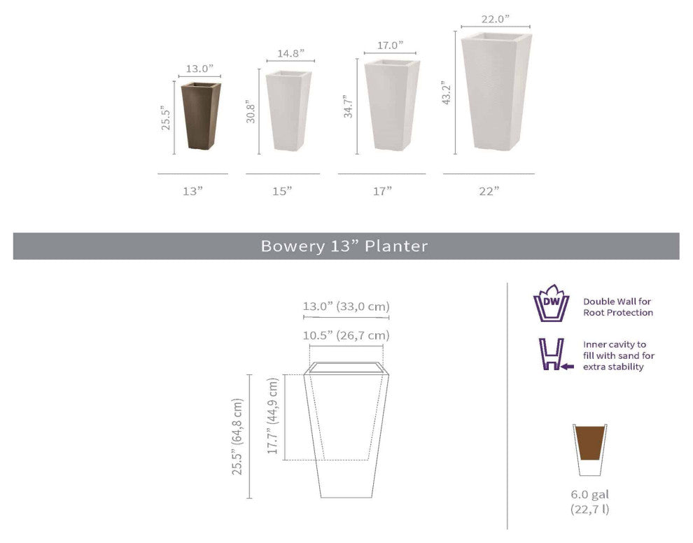 Create a sophisticated look indoors or outdoors by adding tall plants to this textured, square tapered planter. The double-wall feature insulates the roots against the changing temperatures so your plants can thrive. Add a square saucer if you''re keeping your plants indoors for a beautiful look you can enjoy year-round. The 3 different sizes provide you appealing options for grouping these weather-proof and impact-resistant planters. A highlighting feature is the in-built cavity that can be filled with sand for additional stability. Tall double-walled planter is a perfect indoor and outdoor planter. Large soil capacity allows for creating dramatic plant displays. The weather-proof structure ensures the planter won''t fade or crack during extreme temperatures. Sturdy planter shell protected by a 10-year warranty. Constructed with 100% recyclable rotation molded plastic, making it lightweight, chip-resistant and durable.Features a pre-drilled drainage hole for easy planting.In-built cavity that can be filled with sand for extra stability, a much needed feature for windy weather. Inner dimension: 10.5" W x 17.7" H ; Soil capacity: 6 gal (24 dry quarts)