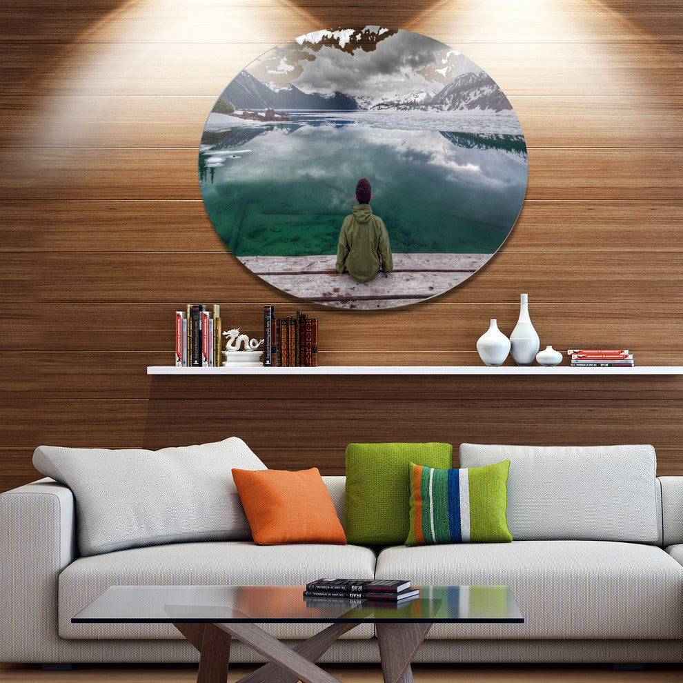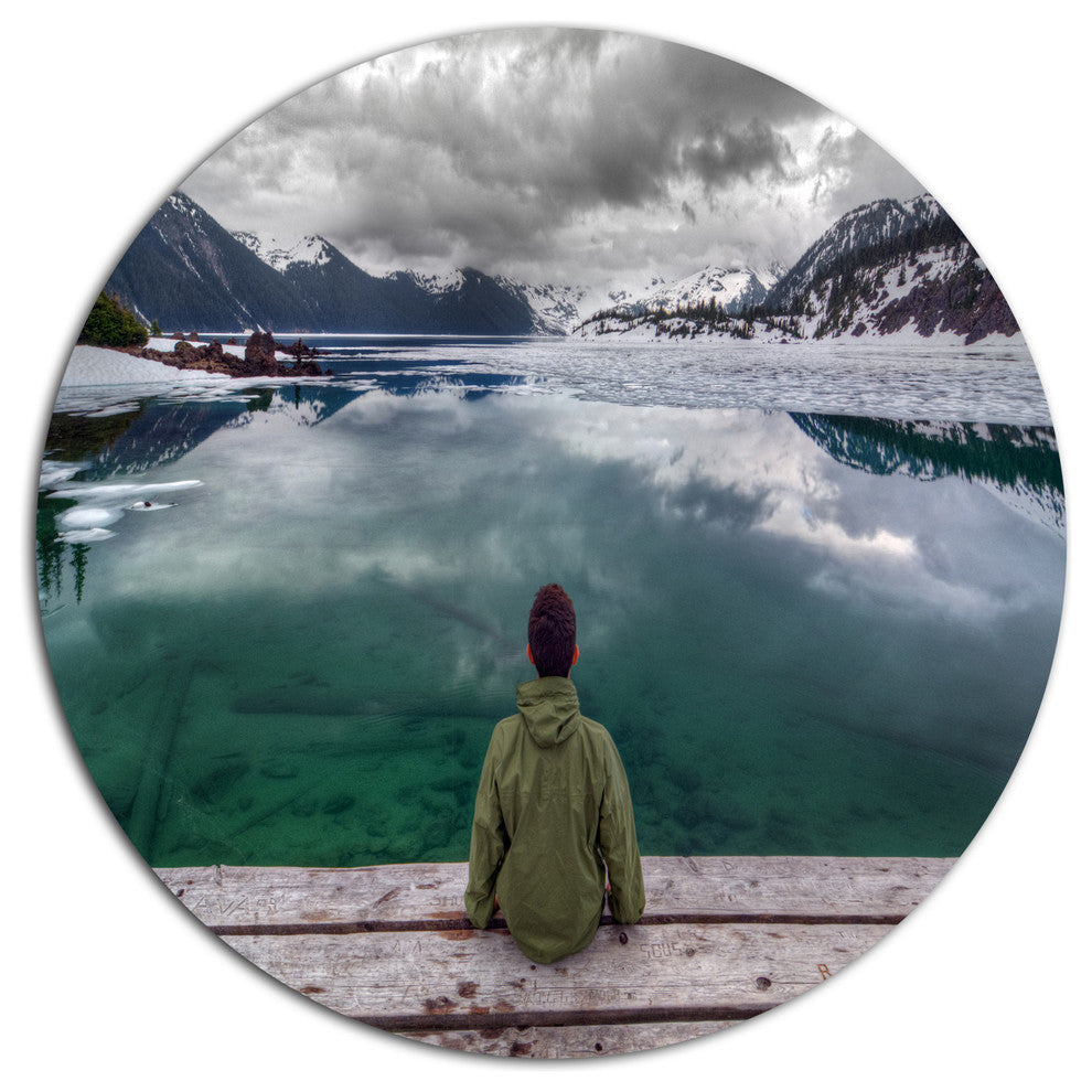 Bring Contemporary Abstraction to your home with this large Circle Metal wall art. This Boy Looking at Clear Mountain Lake Metal Artwork makes it the focal point of any room or office.