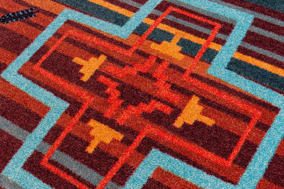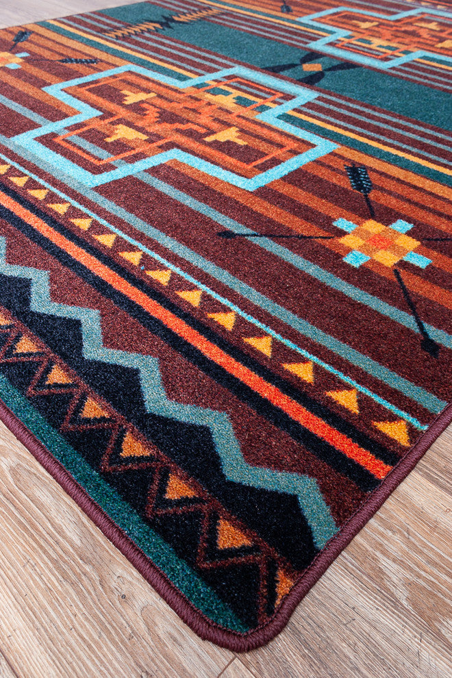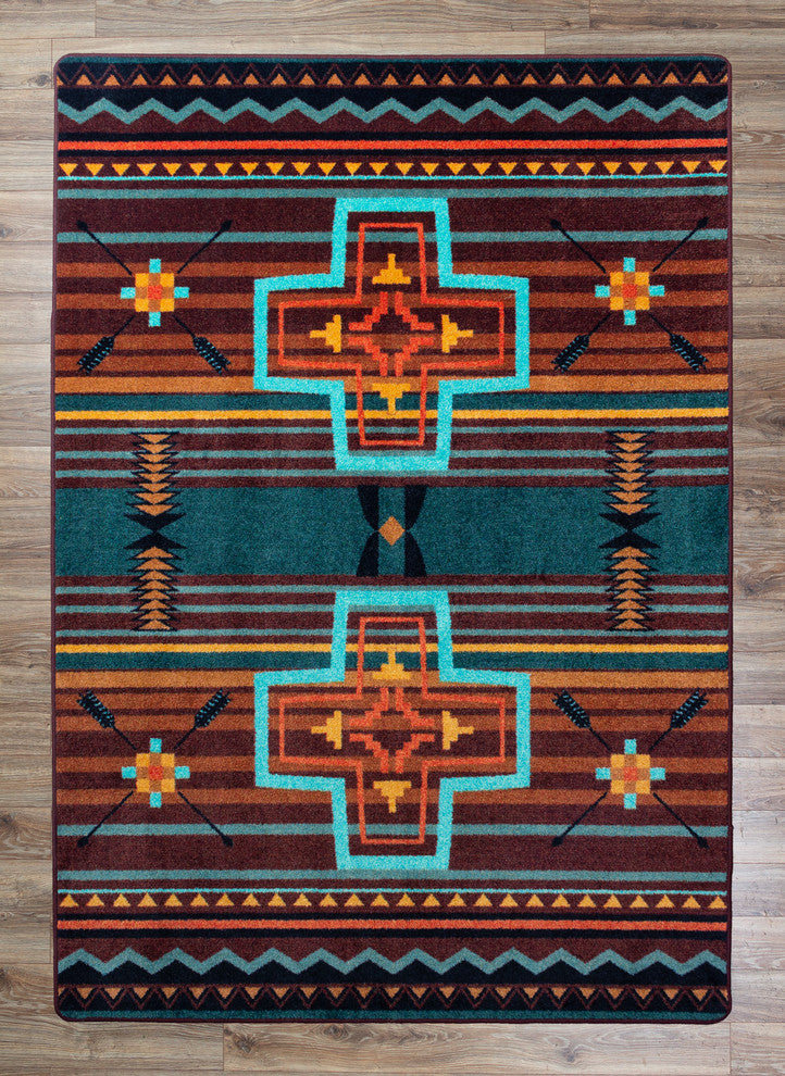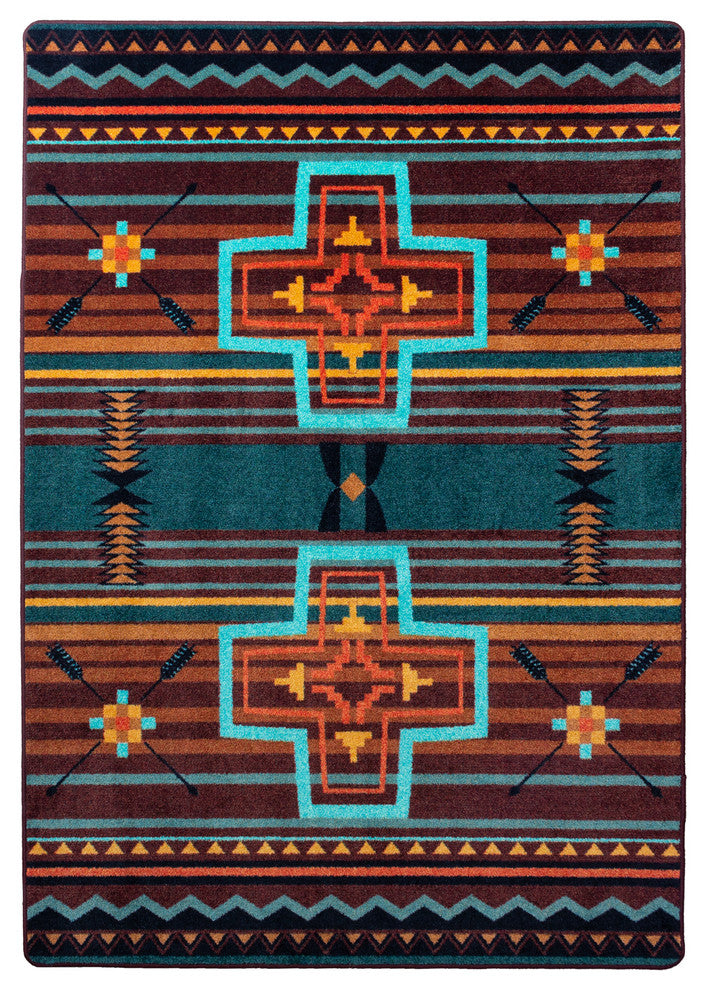 A striking Southwest rug based on vintage camp blanket styling. Interject some Southwest flare into your rustic retreat.