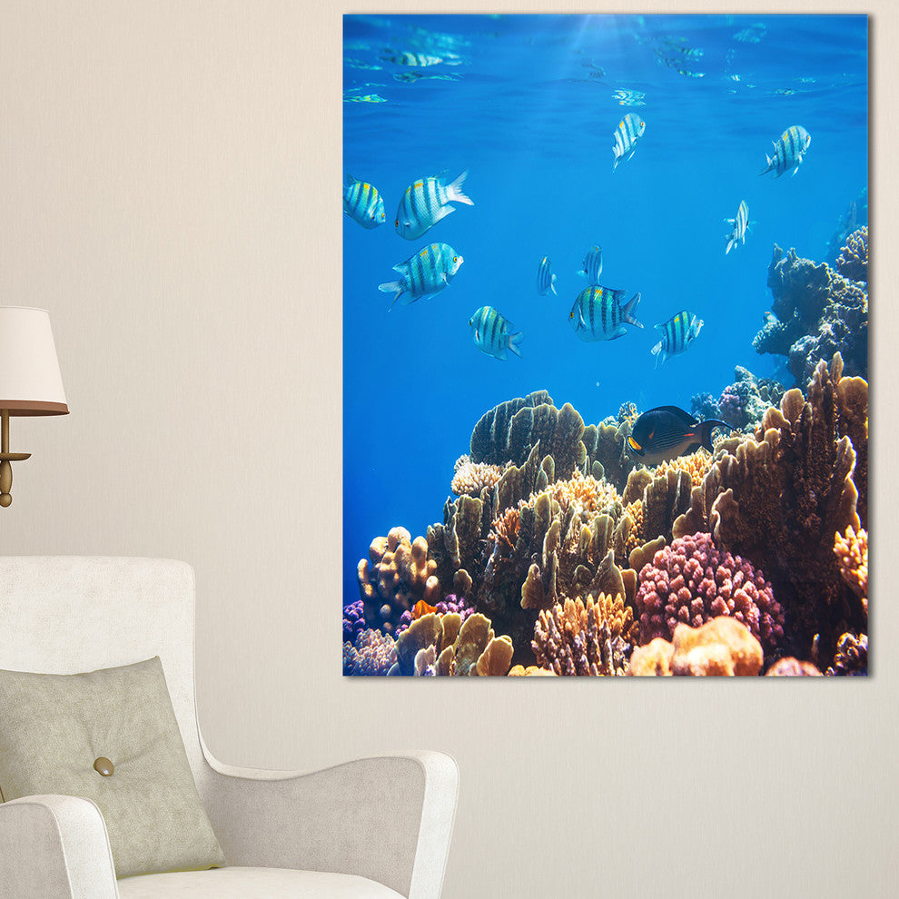 The Bright Blue Waters and Coral Fish canvas art print is sure to make an impression on anyone who sees it. This artwork is gallery wrapped around a 1-inch solid wood frame and arrives carefully packaged and entirely ready to hang on the wall. Design Art only uses the highest resolution and pigments to ensure a crisp colorful print that is never faded or pixelated. This artwork is sure to be a conversation starter in any home or office.