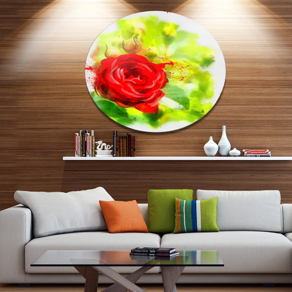 Bring Contemporary Abstraction to your home with this large Circle Metal wall art. This Bright Red Rose on Light Green Metal Artwork makes it the focal point of any room or office.