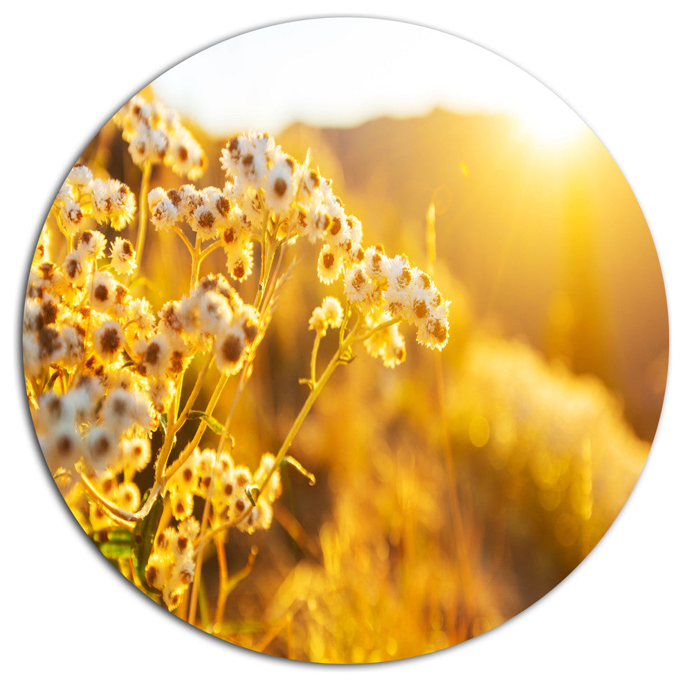 Bring Contemporary Abstraction to your home with this large Circle Metal wall art. This Bright Yellow Rural Garden Flowers Metal Artwork makes it the focal point of any room or office.