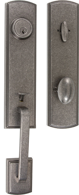 Delaney Hardware Italian Collection Briona Series Residential Single Cylinder Handle Set with Canova Interior in Antique Silver. Equipped with security features including reinforced spring assembly, protective collars, high security strike plate, and interlocking installation guides each door handle set is both visually striking and assuredly dependable.