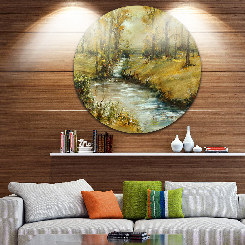 Bring Contemporary Abstraction to your home with this large Circle Metal wall art. This Brook in Autumn Oil Painting Metal Artwork makes it the focal point of any room or office.